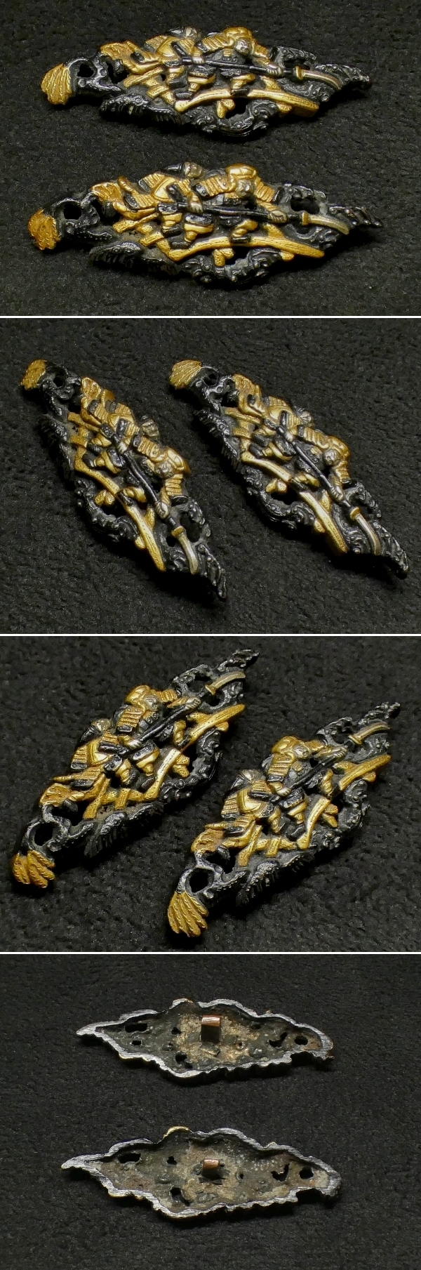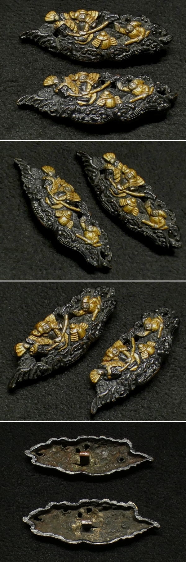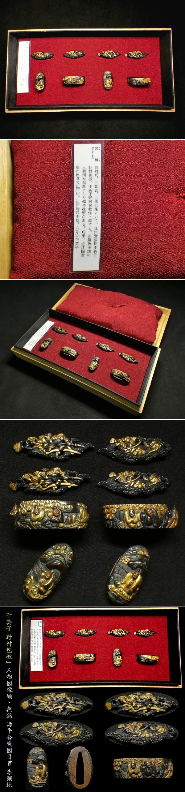 【刀装具 #2373 ★特別出品★】 (大小二所物) 縁頭 :「干英子 野村包教」 人物図 目貫:無銘 源平合戦図 赤銅地 金色絵 收藏