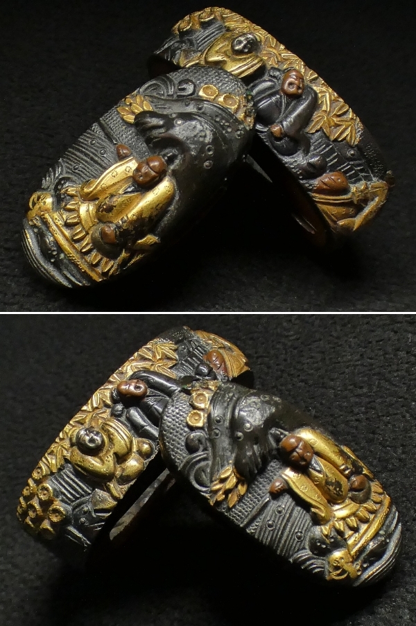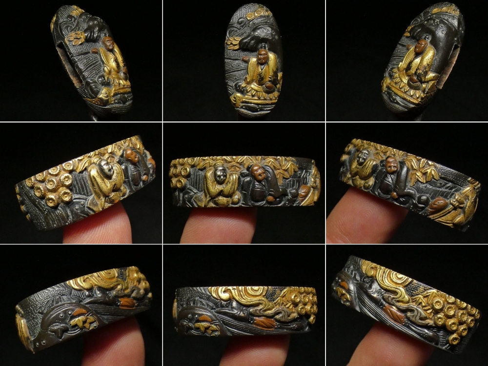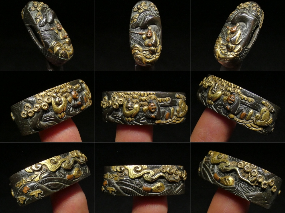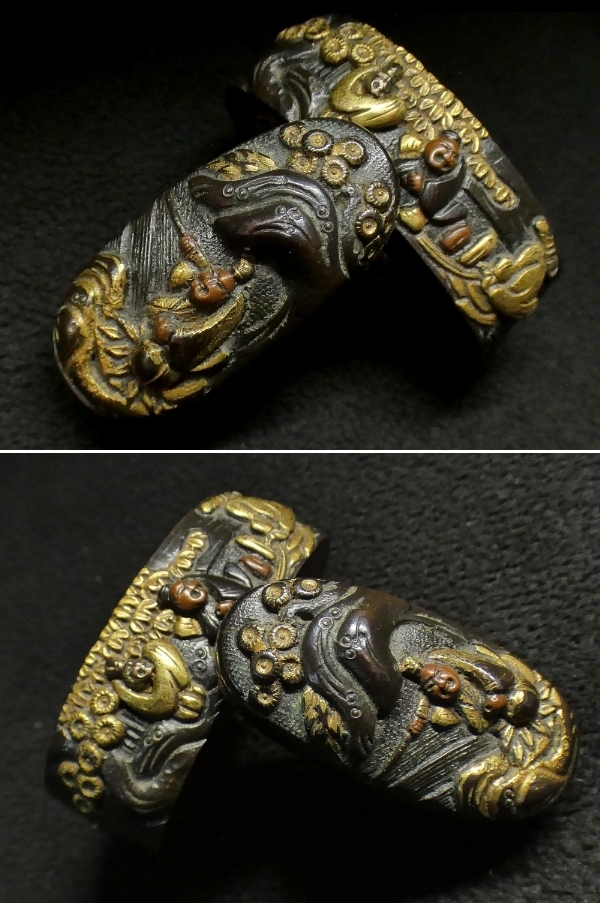 | 商品説明 | 華やかな金色絵と 藻柄子派独特の繊細な細工が施された 拵え映え抜群の一品です。 縁頭・目貫どちらも細部まで繊細な細工が施されており 特に干英子 野村包教 作の縁頭は 細工が非常に盛り上がった見応えある一品です。 お手持ちの拵え用にいかがでしょうか。 【上手の細工技術】 【繊細かつ見応えある細工】 【拵え映え抜群の一品】 寸法: 大 (目貫) 約 4.44cm × 約 1.51cm 約 4.41cm × 約 1.53cm (縁) 約 3.80cm × 約 2.35cm × 約 1.20cm (厚み) (頭) 約 3.38cm × 約 1.64cm × 約 0.83cm (厚み) 小 (目貫) 約 4.24cm × 約 1.50cm 約 4.28cm × 約 1.49cm (縁) 約 3.74cm × 約 2.30cm × 約 1.20cm (厚み) (頭) 約 3.35cm × 約 1.64cm × 約 0.68cm (厚み) 時代: 江戸時代 材質: 赤銅地 共箱ではございませんが保管用の桐箱付 銘 : (縁頭) 干英子 野村包教 状態:特に気になる傷みはなく良好。画像にてご判断下さい。 :許容範囲内の時代傷みはご理解下さい。 |
