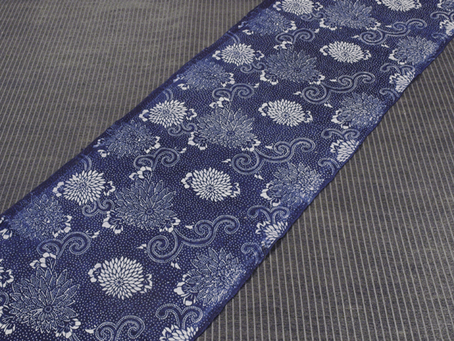 ★【古布】むじな菊唐草文 綿 藍染 型染 はぎれ ハギレ アンティーク 168×35 TANJ06001風楽 收藏