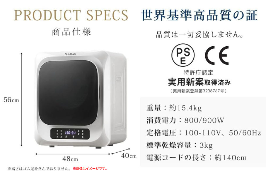 【商品特長】 ◆コンパクトだけど大容量3kg!1~4人の家族でも快適にご使用いただけます 湿度や温度を自動計測して乾燥時間を短縮! 湿度や温度を感知するセンサーが内蔵され、 服の乾き具合によって乾燥時間が短縮されます。 時間短縮、省電力、エコに期待できます。 過剰な乾燥が減るため衣類へのダメージも抑えます。 ◆外干しよりもキレイに乾かす!シワの少ない3D乾燥 乾燥時に衣類が宙を舞うような動きをします。 衣類同士に空間ができ、全体にバランスよく温風が当たるため、 乾燥後はふわふわとした仕上がりに。 衣類の絡まりが少なく、シワになりにくいのも魅力です。 ◆絡まり軽減 逆回転 ドラムは時計回り、反時計回り各方向に回転します。 逆回転を行うことで衣類の絡まりやもつれを軽減。 短時間で全体にバランスよく乾燥します。 ※設置に関しまして、ご使用の洗濯機・設置環境をご確認の上お求めください。 ※動作保証は致しますが万が一初期不良があった場合の設置に関する 費用等は負担致しかねます。ご了承頂きご購入お願い致します。 | |||||||||||||||