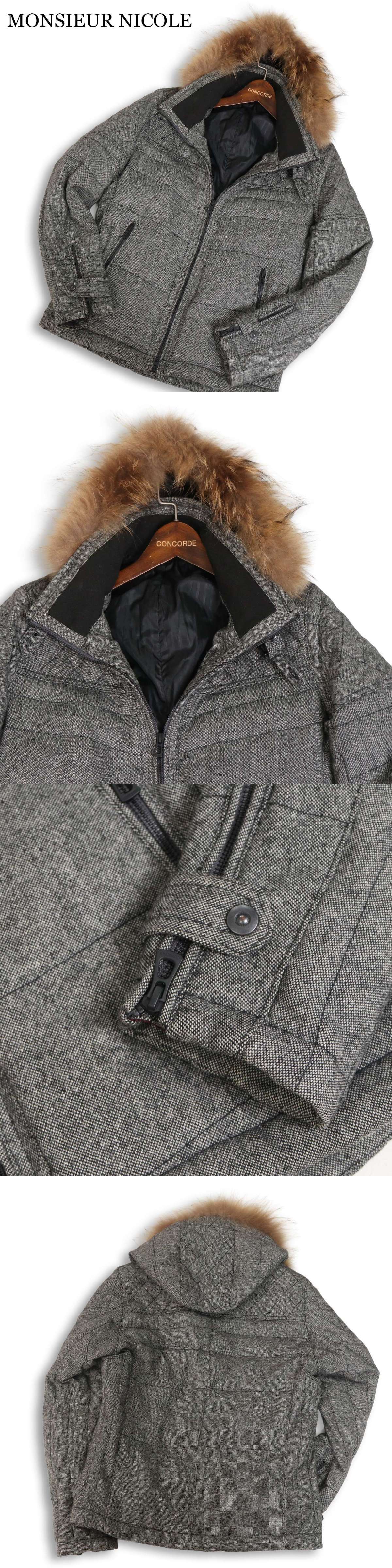 MONSIEUR NICOLE ムッシュ ニコル 秋冬 リアル ファー★ ウール ツイード ライダース ダウン ジャケット Sz.46 メンズ 收藏