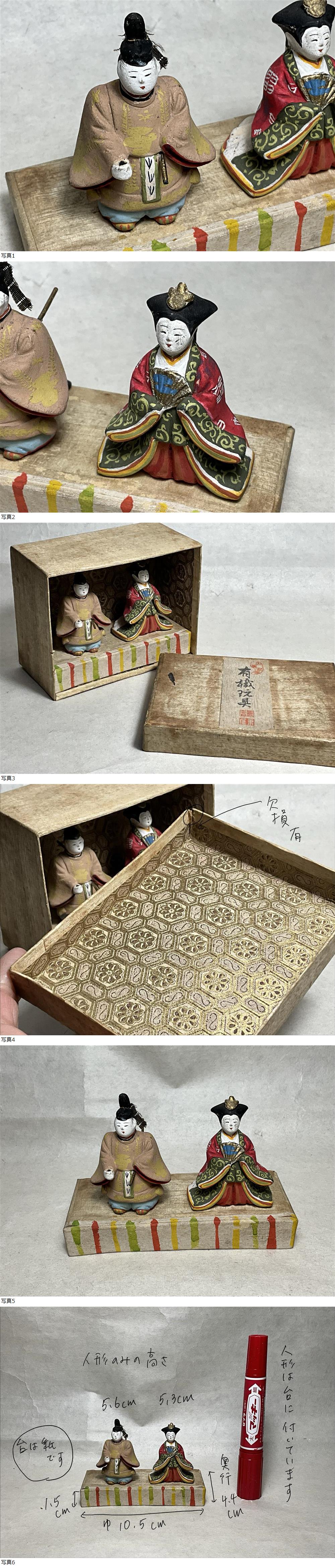 紙箱の欠損や男雛の烏帽子の垂れが取れそうだったりと、全体の汚れ、ヤケ、色スレなど時代のダメージがあります。男雛の尺はありません。
