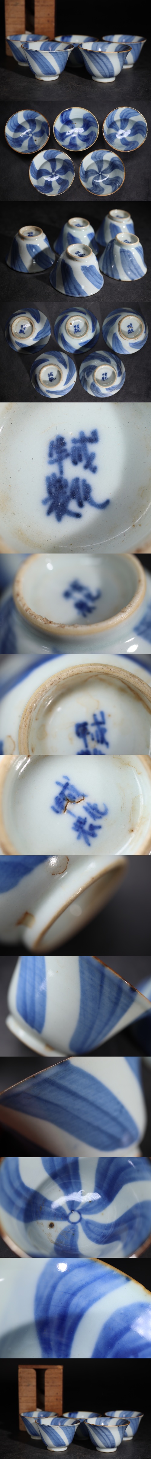 成化年製 底款 染付 渦巻文 煎茶碗 五客 木箱付 / 明 成化 中国美術 茶器 煎茶道具 .G3713 收藏