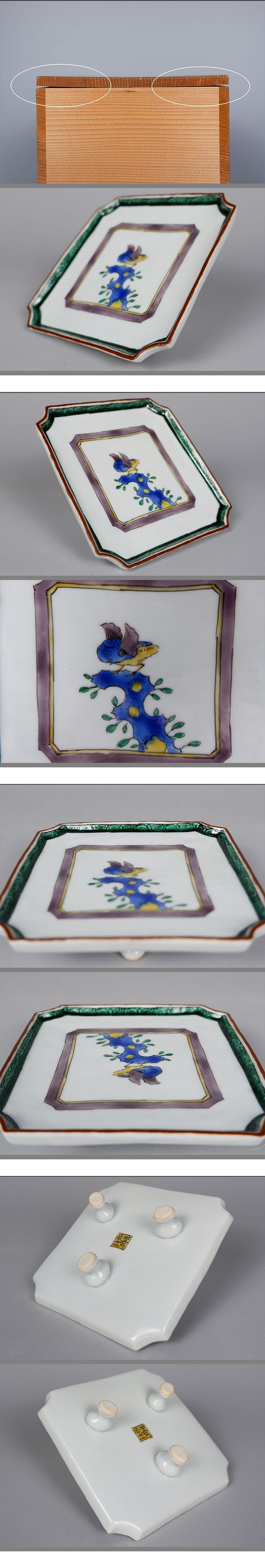 【MKA】須田菁華 古九谷風岩二鳥図四方三脚向付五 共箱 美品 石川 料理屋 懐石 真作保証 收藏