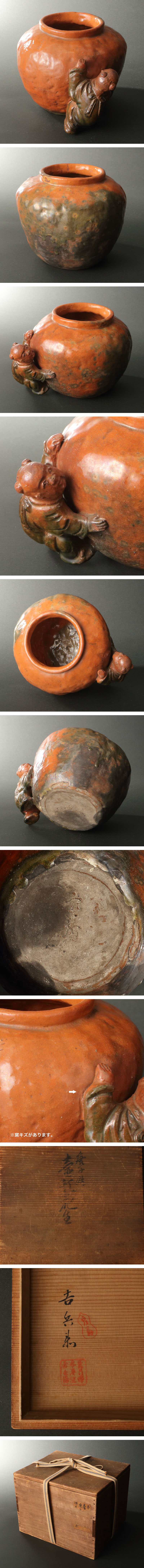 委託HK◇長浜屋吉兵衛 湊焼赤楽唐子玉遊び花入 共箱(茶道具 陶磁器 陶芸 京焼 楽焼 赤楽 花器 花瓶 花生 壺 つぼ 茶事 湊焼 堺 古美術) 收藏