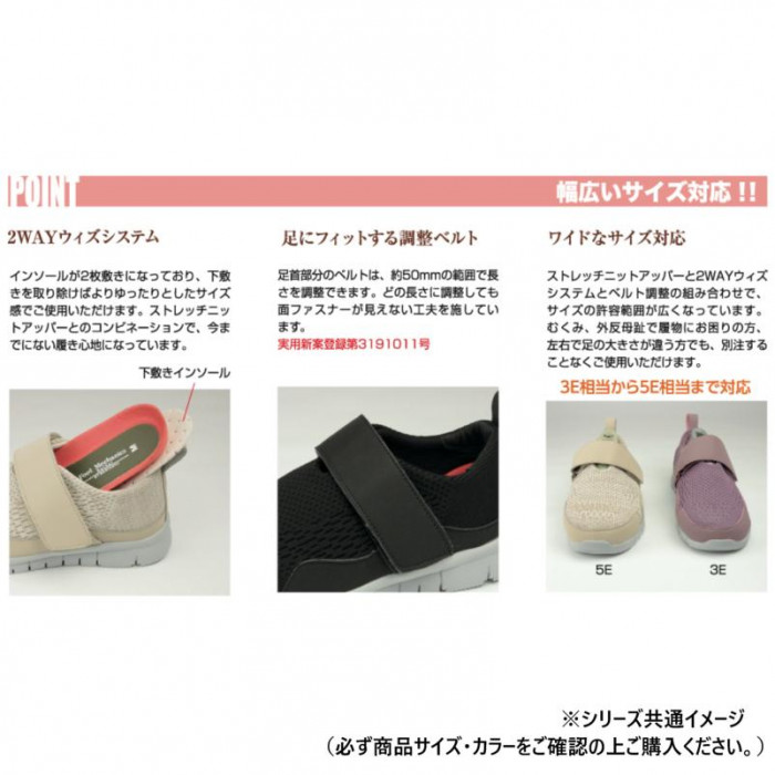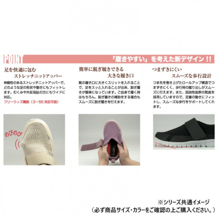 | ストレッチニットで足元らくらく、つまずきにくい安心デザインです。超軽量モデルだから疲れにくい。 |