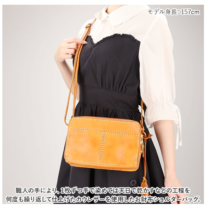 | 商品説明 | ・・職人の手により、1枚ずつ手で染めては天日で乾かすなどの工程を何度も繰り返して仕上げたカウレザーを使用したお財布ショルダーバッグ。 ・【zucchero/ズッケロシリーズ】 ・主な素材にナチュラルレザーを使用したライン。 ・ナチュラルレザーならではのテイストと、現代的なスパイスを取り入れたカジュアルさを両立したバッグ。 ・【こだわりのあるデザイン】 ・ひと目で本革とわかるナチュラルな風合い。素朴な匂いや革本来の色の濃淡が、使い込む程に愛着がわいてくる。 ・クッタリと柔らかくなり、革の色が焼けてくるエイジング・レザーを使用。革本来の持つ、色の濃淡が使い込む程に深みが増し、使い込む程にソフトになり、持つ人に馴染む。 ・経年変化を楽しめるのもポイント。 ・【ボックス型&お財布機能つき】 ・コロンとした可愛らしいボックス型。ちょっとしたお出掛けにも便利なお財布ケースつきなので、このバッグ1つで出かけらるのもポイント! ・内側は細かく分かれており、カードも収納可能。 ・【ショルダーベルト】 ・長さ調整可能なショルダーベルトなので、肩掛け、ななめ掛け両スタイルが楽しめる。 ・【ポケット仕様】 ・メイン:オープンポケット×2 ・お財布:カード入れ×6 小銭入れ×1 お札入れ×2、オープンポケット×1 ・背面:オープンポケット×1 |
