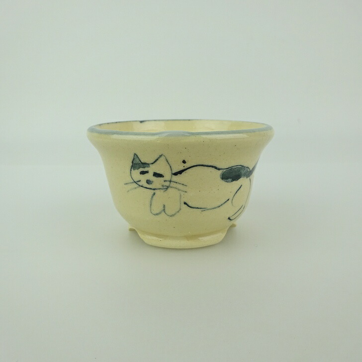 盆栽鉢 ゆうき祥石 小鉢 長辺 約 6.3cm 丸鉢 落款なし 絵鉢 猫 ネコ ねこ 肉球 釉薬 観賞用 現品 新品 收藏