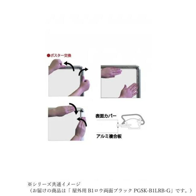 | 素材・材質 | 本体:アルミ押出し、アルマイト仕上(ブラック) パネル:ポスターグリップ(フロントオープン式)(ブラック) 表面カバー:アクリル 透明1.5mm厚 背面板(屋外用):アルミ複合板(白) |