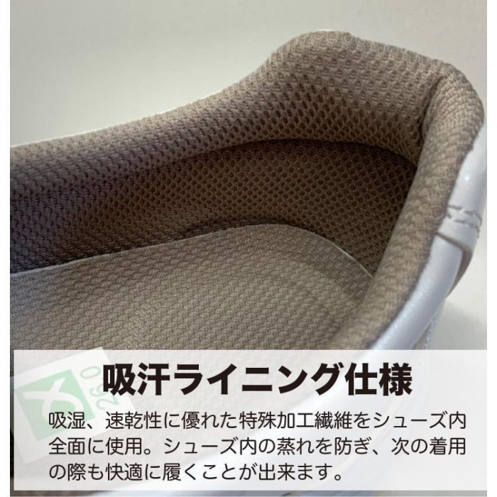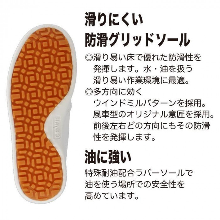 | 水・油を扱う滑りやすい作業環境に適しています。底面の意匠は多方向に効くウインドミルパターンを採用。軽くクッション性の良いEVA製ミッドソールの採用と十分な厚みを持たせる事により、疲れにくい適度なクッション性を実現いたしました。足囲3E採用でゆったりとしたフィット性で長時間の使用でも疲労を軽減し、より快適です。 |