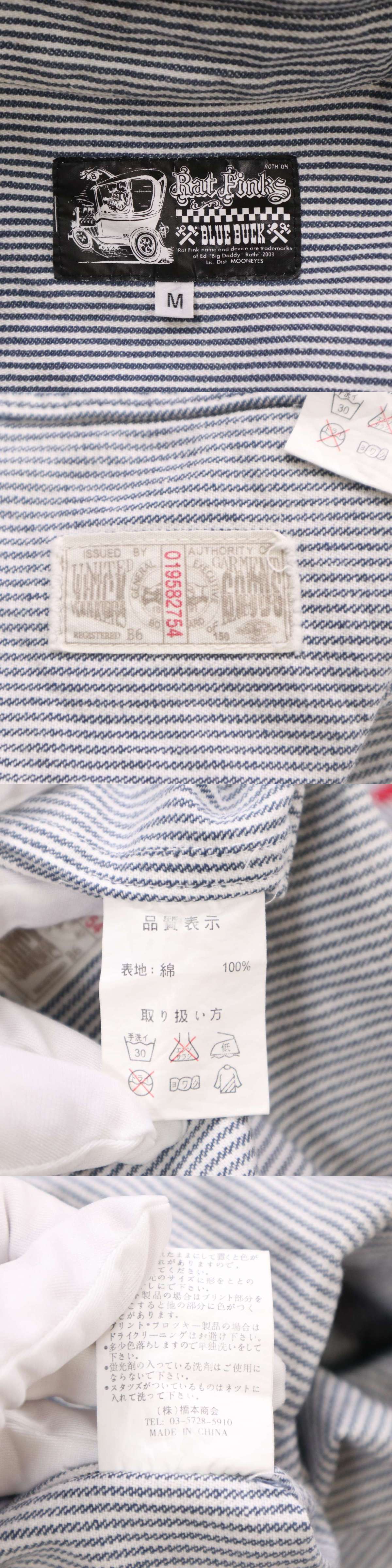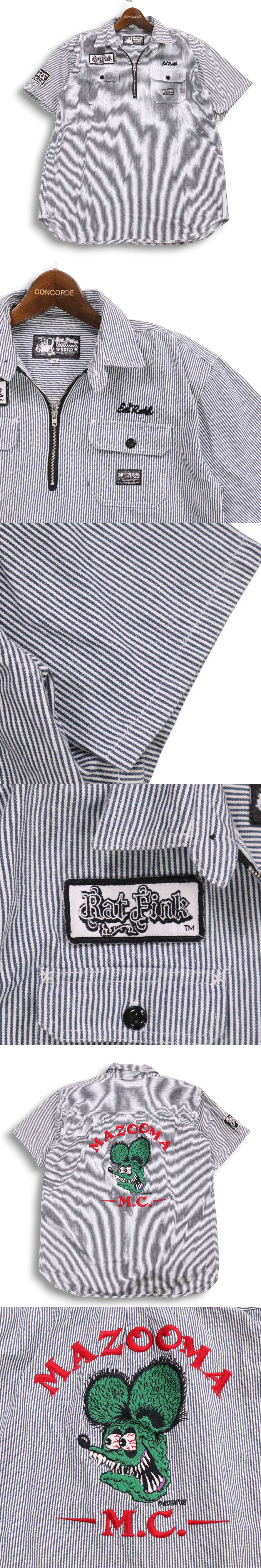 Rat Fink ラットフィンク 春夏 刺繍★ ヒッコリー ストライプ 半袖 プルオーバー ハーフジップ ワーク シャツ Sz.M メンズ 收藏