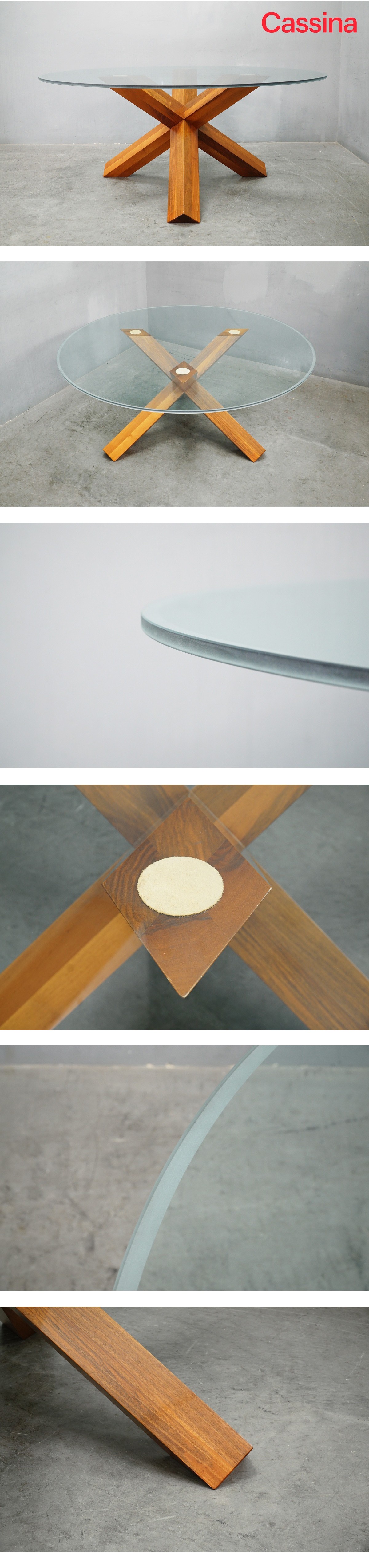 ◇Cassina(カッシーナ)の452 LA ROTONDA(ラ ロトンダ) テーブルです。 3本の木材が絡み合ったように見える脚部は、軸となる1本の脚のホゾ穴に4方向から3枚のホゾが付いたパーツが差し込まれ、そのホゾが内部で絡み合い形成されています。見た目はシンプルですっきりしていますが、複雑で頑強な内部構造により、ダイナミックな迫力としっかりとした安定感を生み出しています。ガラス天板は15mm厚のガラスを採用。どの角度から見ても美しい脚部を堪能できます。こちらはクリアガラス天板とアメリカンウォールナット材の組み合わせです。 参考新品価格(約):2,288,000円 |