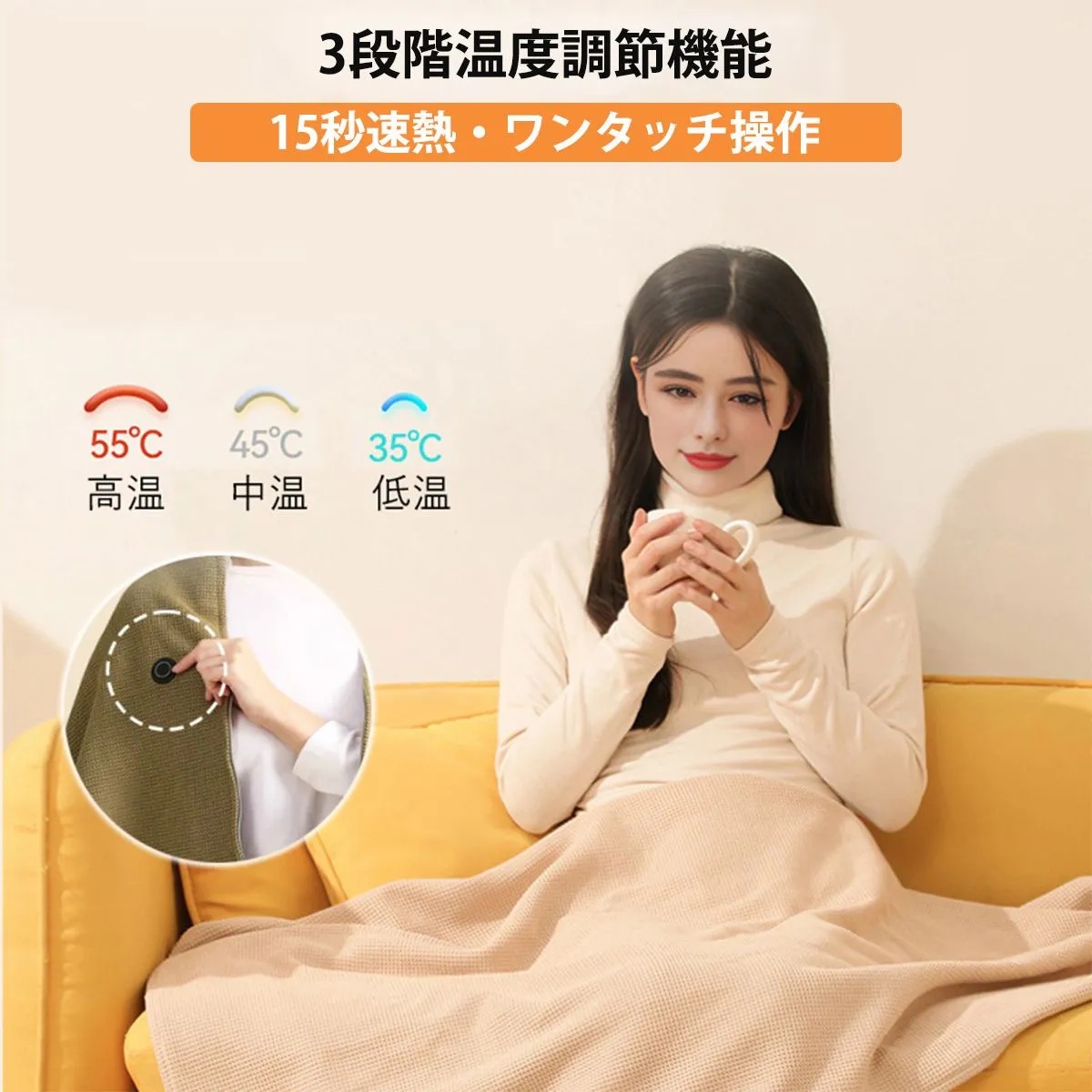 ワンタッチ操作で温度調節も簡単。電源を入れてから約15秒で素早くあたたまるので、寒さを感じた瞬間にすぐポカポカ。