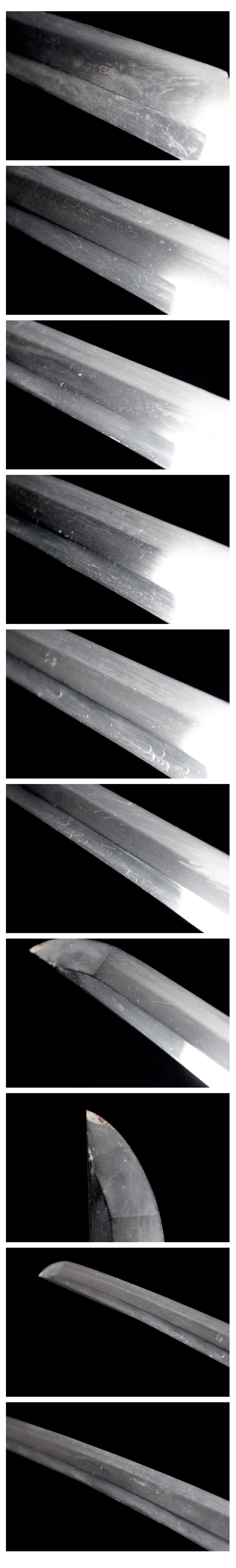 刀身長:2尺2寸8分(約69.2cm) 反り:6分(約1.8cm) 目くぎ穴:1個 元幅:約30.6mm 元重:約7.1mm 先幅:約22.5mm 先重:約6.1mm 刀身重:約748g 棟:庵棟 ハバキ:銅 |