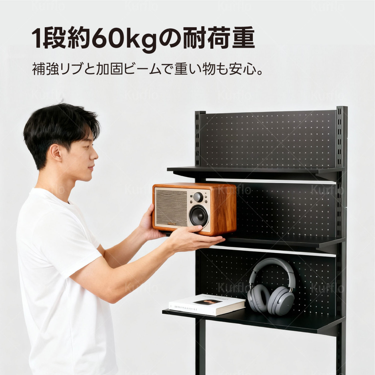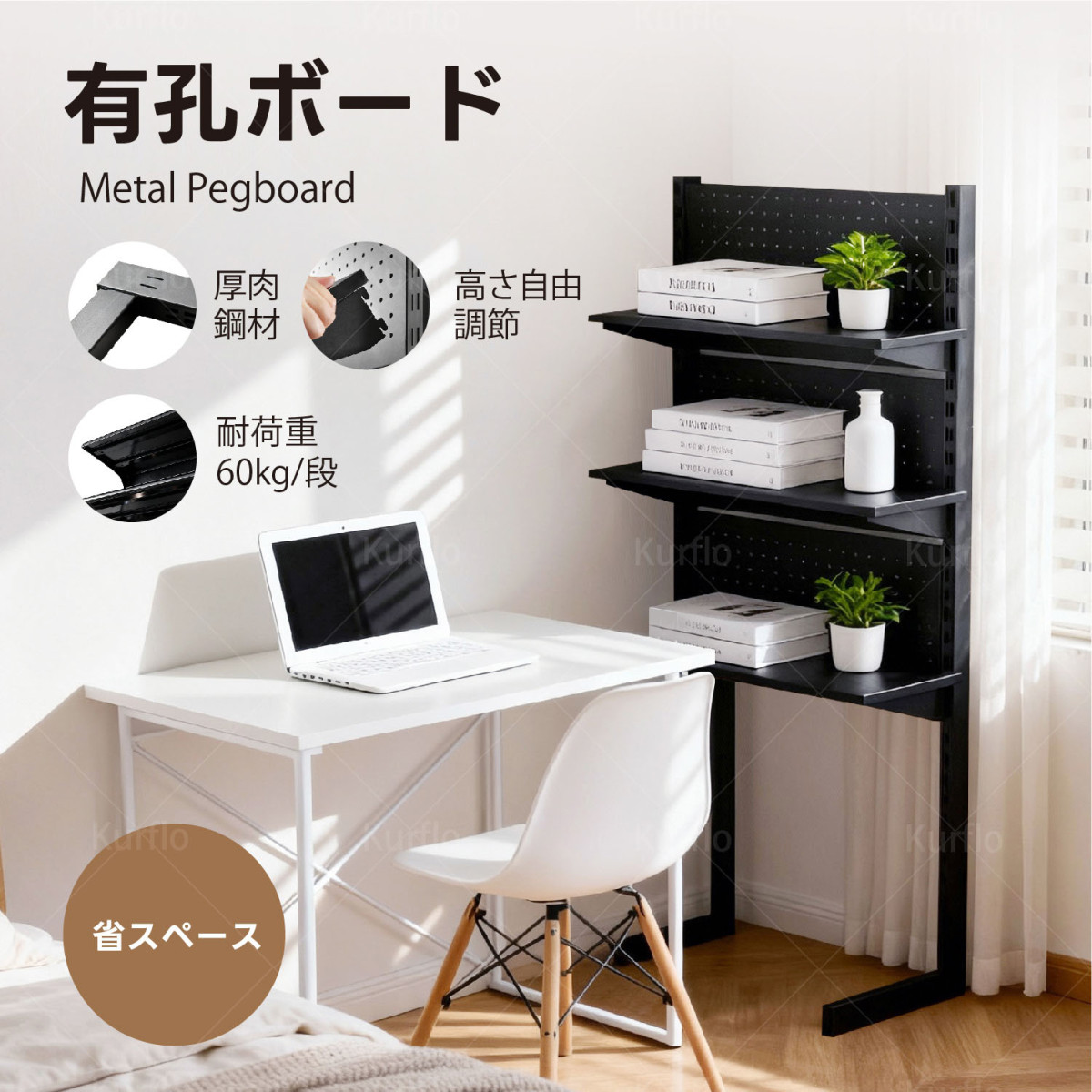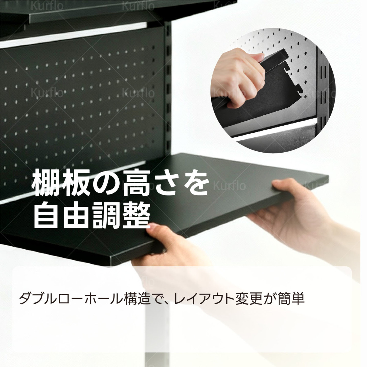 Kurflo 有孔ボード デスクの向こう側 ウォールラック 可動棚 自立式 パンチングボード スチール製 棚高さ調整 186×75cm (ブラック) 收藏