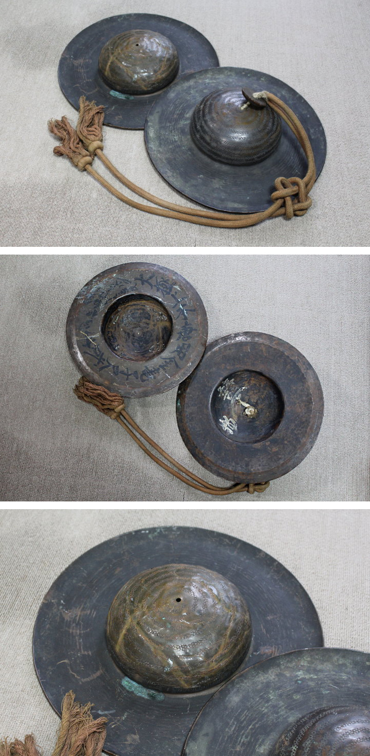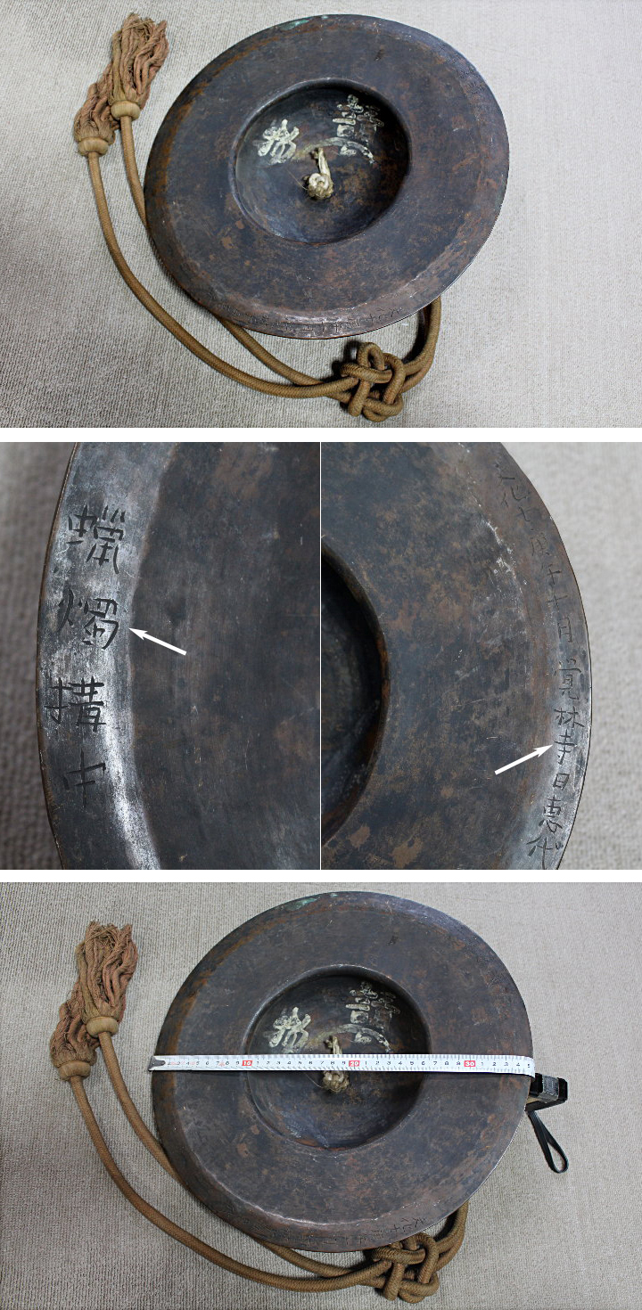 サイズ:径 約35cm 重さ 約2.5kg 時代のある妙鉢です。 裏に 文化七庚午十月覚林寺~の文字が刻 蝋燭~の文字が刻 墨書きで大極上本唐用金亀子尺貳寸~ があります。 読みなどは間違えているかもしれません。 胴を打ち出して作られているようです。 傷みがあります。 新しい傷もあります。 紐は片方は無くなっています。 妙鉢用紐 で検索。通販で購入できます。 ◇妙鉢とは 妙鉢はご法要や葬祭・葬儀の際にシンバルのように打ち鳴らす楽器で、元々は中国から伝来したといわれています。(はつ)または妙鉢(みょうはつ)とも呼ばれます。ご法要の最初と最後に妙鉢すり合わせるように鳴らすことで、仏様をお呼びし、お帰りいただく合図として使用されています。 | |
