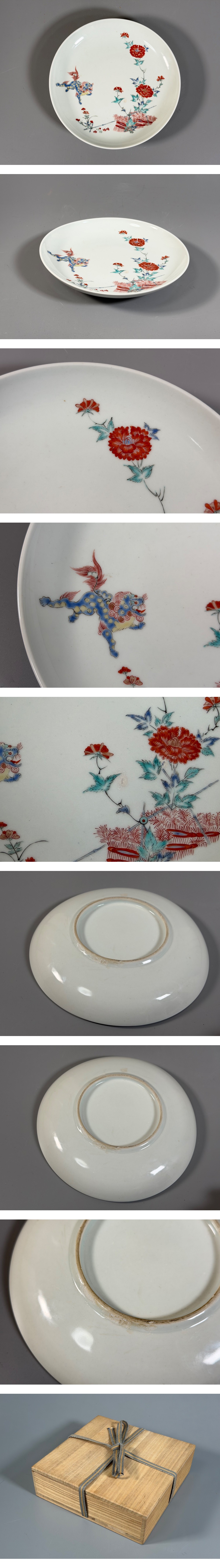 【小】5595 江戸後期 古伊万里柿右衛門 色絵唐獅子牡丹図八寸皿 保管箱有 古伊万里 色絵柿右衛門 收藏