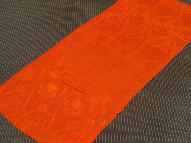 緋色の地に、草花でかたどられた立涌(たてわく)の地紋が織り出されている、紋羽二重のはぎれです。 大正から昭和初期ごろにつくられたと思われるアンティークのお品です。深みのある緋色がアンティークならではです。やわらかなハリのある羽二重地です。 画像のとおり、縫い跡にヒケによる裂け気味の部分がところどころにあり、裏打ちされている部分がちらほらとあります。直径約 0.1-0.5mm の小穴が 2、3 か所ありますが、あまり判別はつきません。そのほかに目につく大きなしみやよごれ、褪色などのダメージはなく、この時代のものとしては、きれいな状態です。生地の力はあります。 |