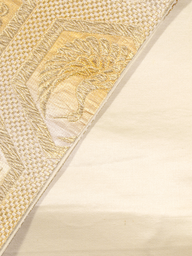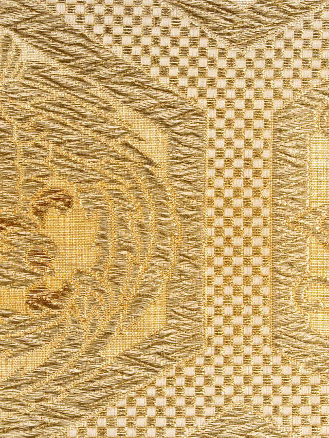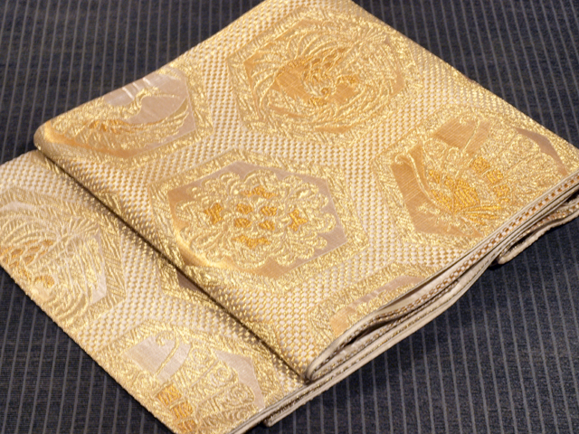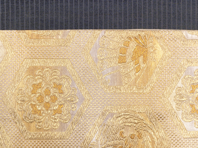 全体的な印象としては、淡い亜麻(あま)色の地に金糸でこまかな市松格子縞の地紋と揚羽蝶、鳳凰(ほうおう)、宝相華(ほうそうげ)、鶴丸などの小紋が配された亀甲つなぎの文様が織り込まれている、西陣織の袋帯です。 気品のある輝きが格調の高い雰囲気を醸しています。帯芯が入れられておらず、両端折り返し内側の綴じもないお仕立てですが、このままお使いいただけます。軽めの帯がお好みの方におすすめです。 ユーズド品で、前の折り跡と結びジワがうっすらとあるほか、裏地に直径約 0.5-1mm のうすよごれが数か所程度ありますが、とくに気になるようなものはありません。そのほかに目につく大きなしみやよごれ、褪色などのダメージはなく、全体的には良好な状態です。 |