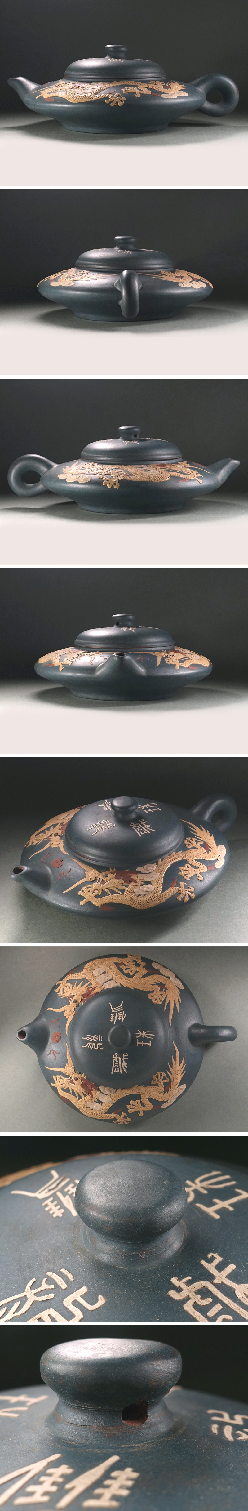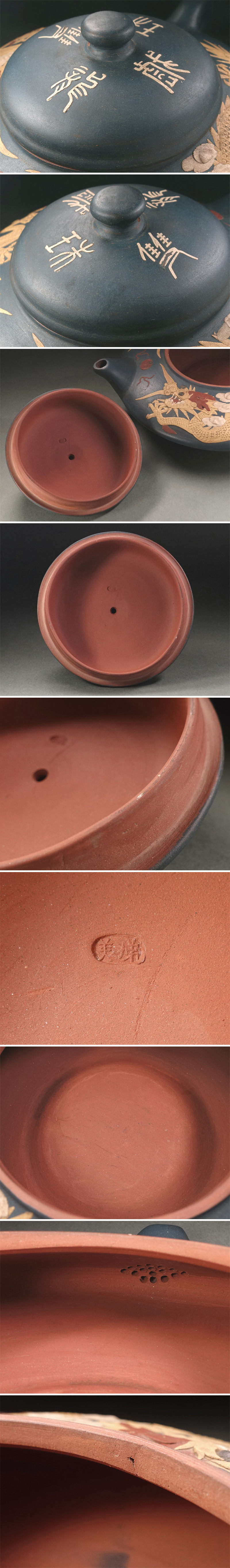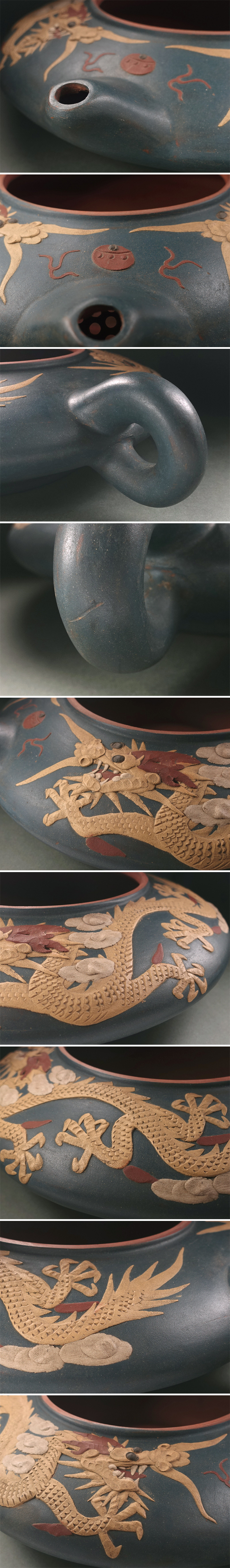 ∇花∇中国美術 青碧地貼花双龍戯珠文水注 朱泥急須 茶注 茶壷 茶器 幅36.5×28.5cmの大サイズ 收藏