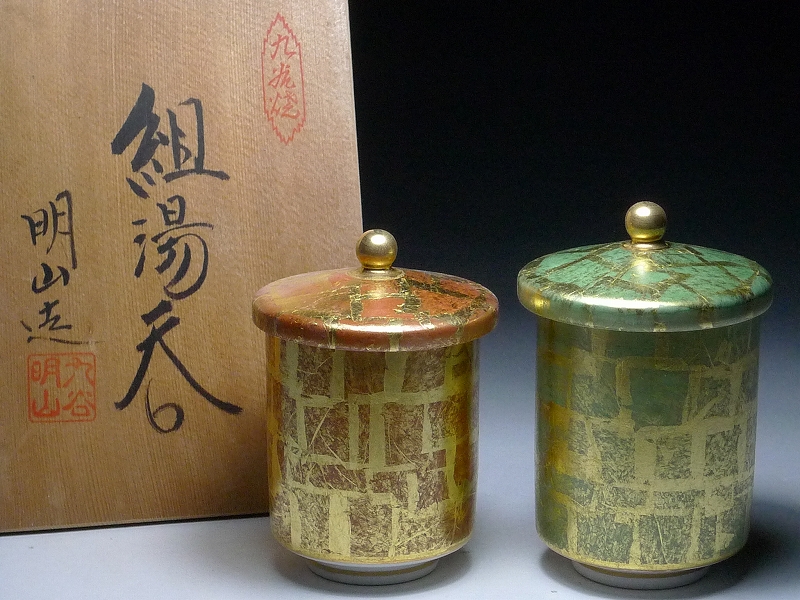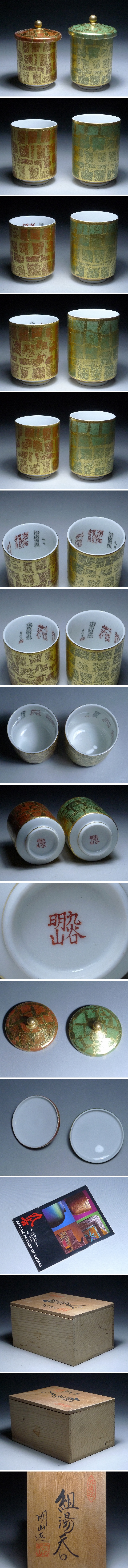 80MK173★九谷焼・明山造・組湯呑・蓋付・共箱 栞付き・夫婦湯呑み・陶器・金彩・和食器 茶器 伝統工芸 古美術 收藏