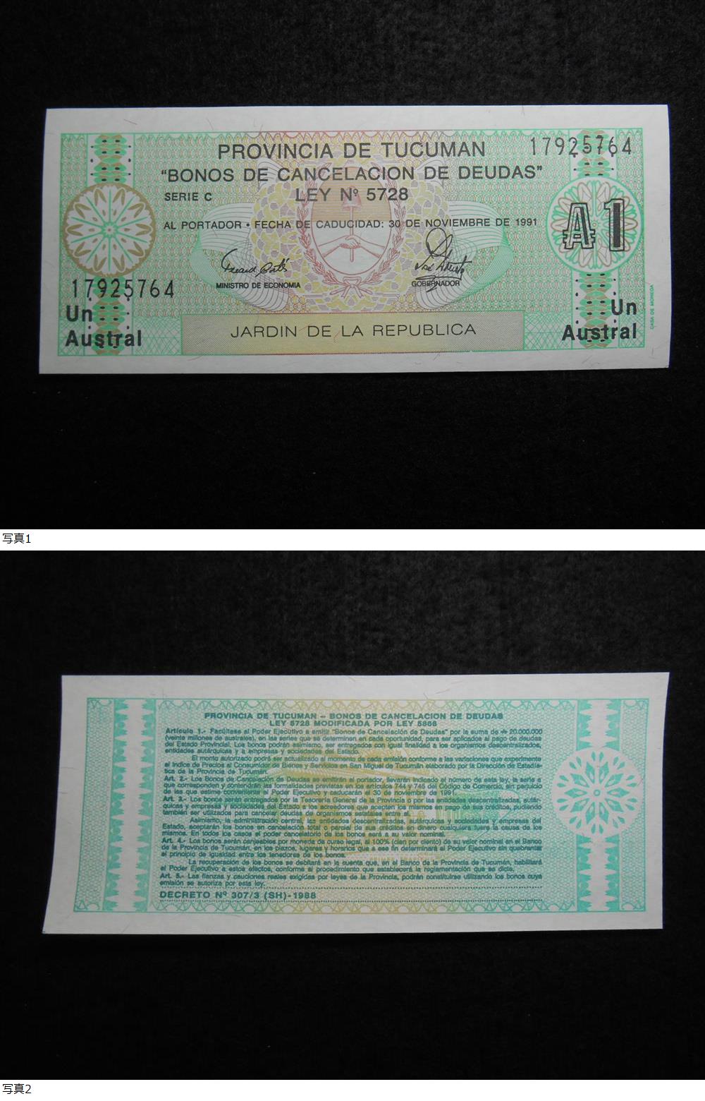 旧紙幣 アルゼンチン 1アウストラル 1988年 未使用 B-0075 收藏