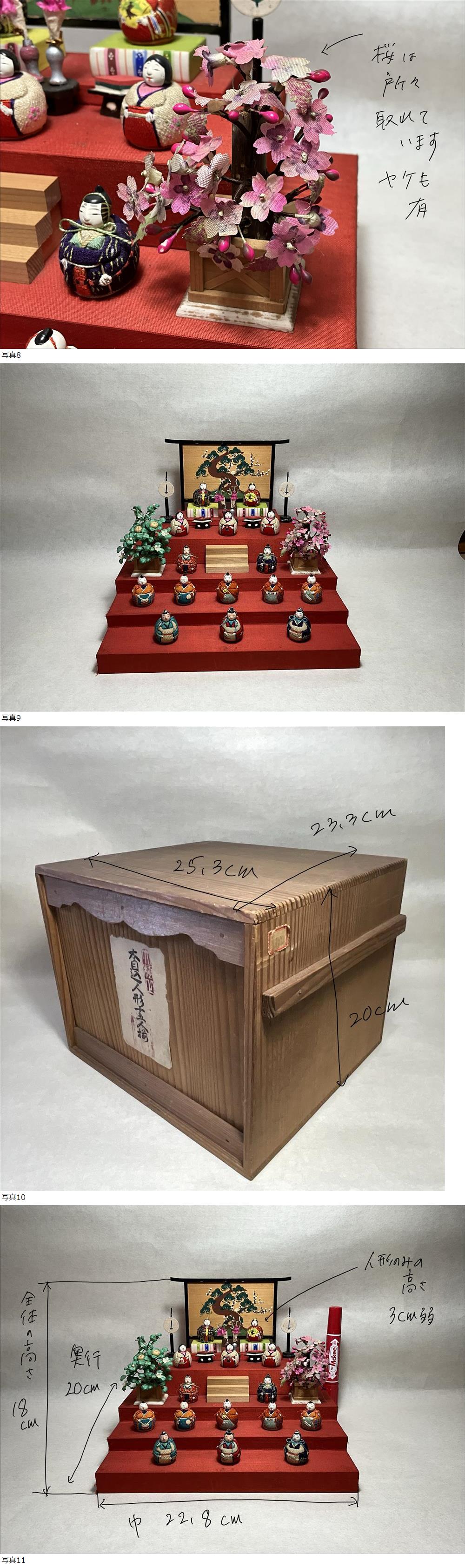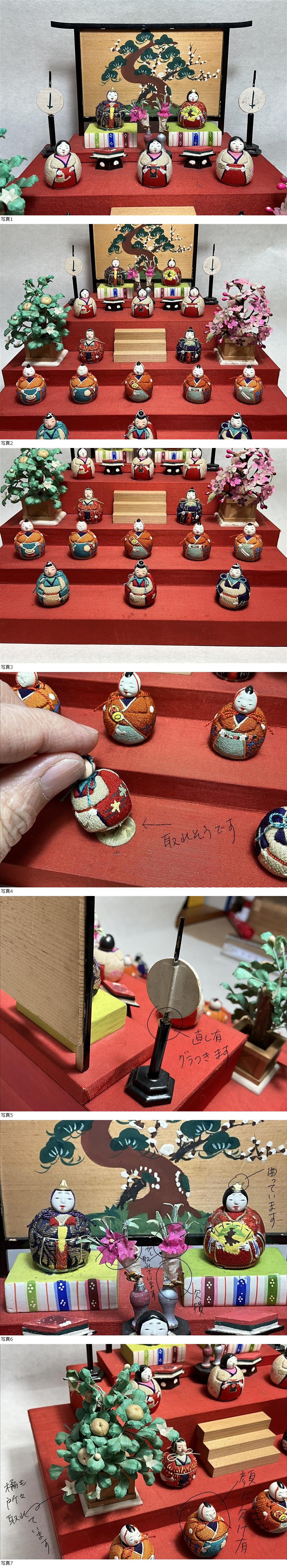 行灯は直し跡があり少しグラツキがあります。桜橘も所々花びら等がなく、ヤケもあります。三人上戸の一人が台から取れそうになっています。五人囃子の一人のお顔に削れがあります。徳利の花も当たりがあり曲がっています。姫さまの冠が曲がっています。(すべて画像参照)