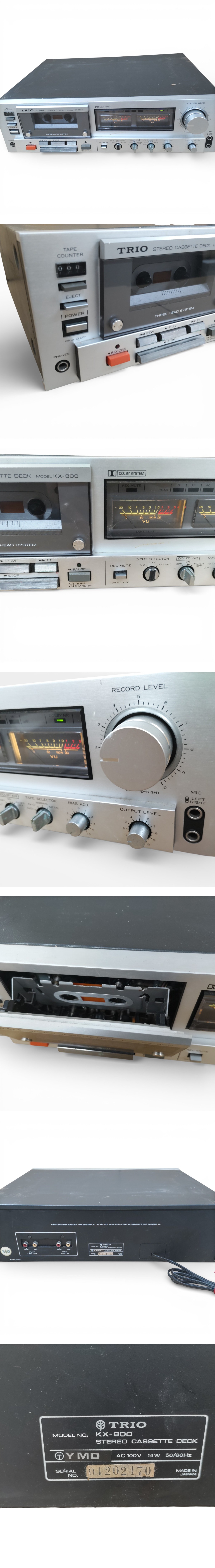 | ※必ず最後までお読みください。 Please be sure to read to the end. 一定要到最后※ | 商品概要 | -95数あるオークションの中からこちらの商品をご覧頂きまして誠にありがとうございます! ※商品説明と注意事項を必ず全てお読み頂いた後にご入札下さい※ 引き続き 安心できる気持ちの良いお取引を心掛けてまいりますのでどうぞ 宜しくお願い致します! 色んなジャンルの商品を多数出品しておりますので、こちらをクリックしてご覧ください!! 東京都公安委員会 古物商許可 第307781505147号 ◎トリオ◎TRIO KX-800 3ヘッドステレオカセットデッキ 通電確認済 中古現状 即発送 ※最下部にも写真掲載中なので必ずご覧下さい。 【商品概要】 メタルテープ対応の3ヘッドステレオカセットデッキ。 録音・再生ヘッドを分離して一つのケースに収めるコンビネーション3ヘッド方式を採用しています。 この方式では録音ヘッドと再生ヘッドのそれぞれに適したギャップ幅が得られ、飽和レベル、ダイナミックレンジが向上しています。また、コンビネーションヘッドは録音・再生ともにカセットハーフの中心窓が使えるため優れたヘッドタッチを実現しています。 メタルテープにも対応したテープセレクターを搭載しています。 テープセレクターではバイアス、再生イコライザー、録音イコライザー、録音感度を一つのスイッチで切替える事ができます。 さらにファインバイアスチューニング機構を搭載しており、同一種類でも各テープによって異なる適正バイアス値に対応しています。 新開発のメカニカルロジックコントロール機構を採用しており、モーターのフライホイールの回転力を利用する事で軽い感触でスイッチが押せます。 また、RecordボタンとPauseボタンにはLEDインジケーターをつけて操作ミスを防止しています。 テープノイズを抑えるため、ドルビーノイズリダクションシステムを採用しています。 またドルビーNR3段、MPXフィルター2段切替となっており、FM録音時はドルビーNRをON、MPXフィルターもONポジションで、レコードなどの録音時にはドルビーNR ON、MPXフィルターOFFポジションで使用します。 電源回路には本格的な安定化電源を採用しています。 これにより従来のリップルフィルターに比べて安定性を向上しています。 Rec Muteスイッチを押している間、レコーディングボリュームをしばらずに無音録音ができます。 FMエアチェック時にコマーシャルやアナウンスをカットして、曲と曲の間に適当な無信号部分を作る事ができます。 タイマースタンバイ・メカを搭載しており、タイマーを接続して、好きな時間にテープのスタート、ストップができます。FM留守録音や、目覚まし再生、スリープ再生も可能です。 ライン入力回路とマイク入力回路を独立しており、ライン入力はマイクアンプを経由せずに直接録音アンプに送られます。 これによりライン入力録音時のダイナミックレンジが拡がり、SN比が改善しています。 また、マイクATTポジションにするとマイク入力が-12dB減衰し、高感度マイクの使用時にも歪の少ない録音が出来ます。