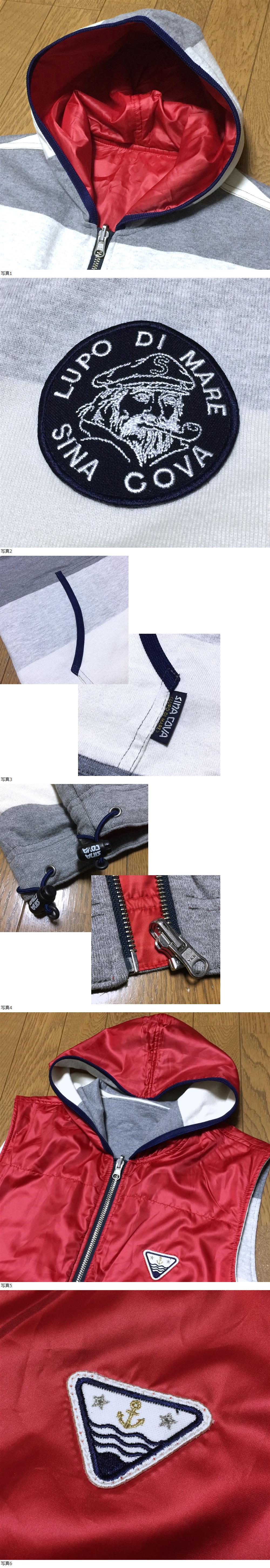 SINA COVA シナコバ 船長 ワッペン スウェット リバーシブル 中綿 フード ジップ ベスト メンズ M グレー系 ボーダー × レッド マリン 收藏