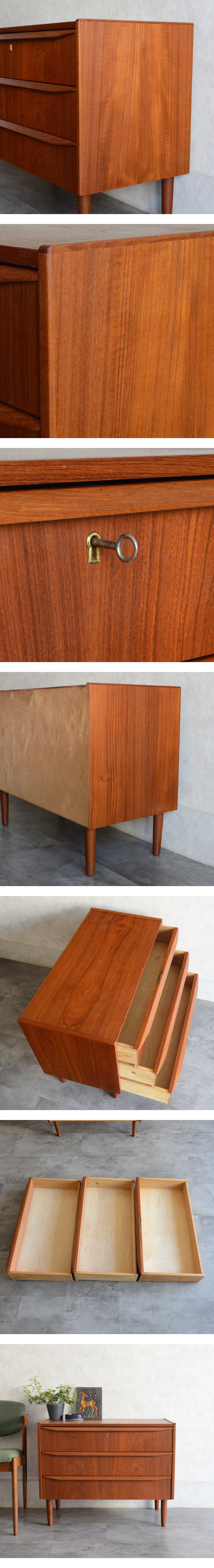 デンマーク 北欧ヴィンテージ チーク 3段チェスト 鍵付 北欧家具 ミッドセンチュリー サイドチェスト 北欧デザイン オイル仕上げ 洋タンス 收藏