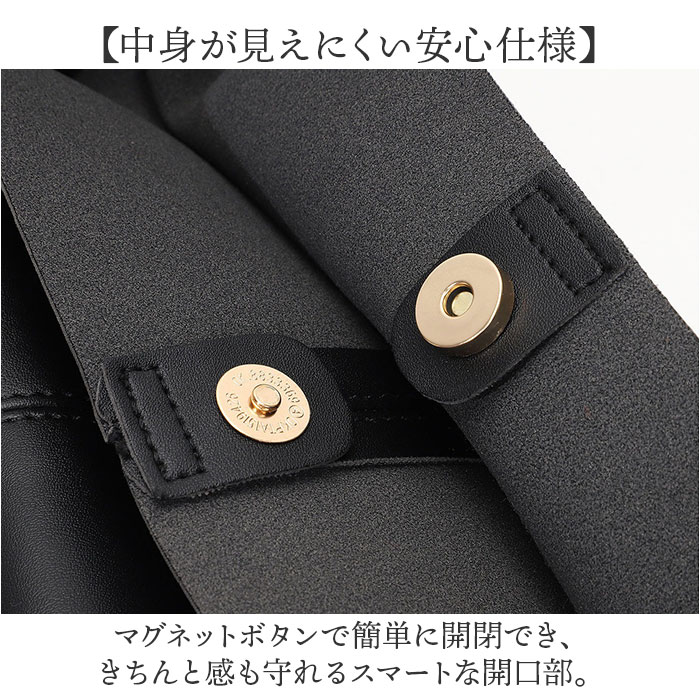 | 商品説明 | ・・【毎日に寄り添う大人トート】 ・シンプルでスタイリッシュなデザイン。「トートバッグ A4 ミニバッグ付き」が登場。 ・【中身が見えにくい安心仕様】 ・マグネットボタンで簡単に開閉でき、きちんと感も守れるスマートな開口部。 ・【A4がすっきり収まる安心感】 ・・13インチ程度のPC、書類や必需品をまとめて持ち歩ける、頼れる収納力。 ・【肩がけしやすい長めハンドル】 ・華奢見えする丸細ショルダーは、軽やかで女性らしい持ち心地♪ ・【やわらかフェイクレザーの上質感】 ・手に馴染むしなやかさと、どんなスタイルにもマッチする上品さが◎ ・【ちょこっと収納の嬉しい相棒】 ・同素材のミニバッグ付きで、小物の仕分けにも便利。 ・【どんな服にも馴染む万能カラー】 ・通勤や通学、フォーマルにも使える、大人にうれしいベーシックな色合い。 |