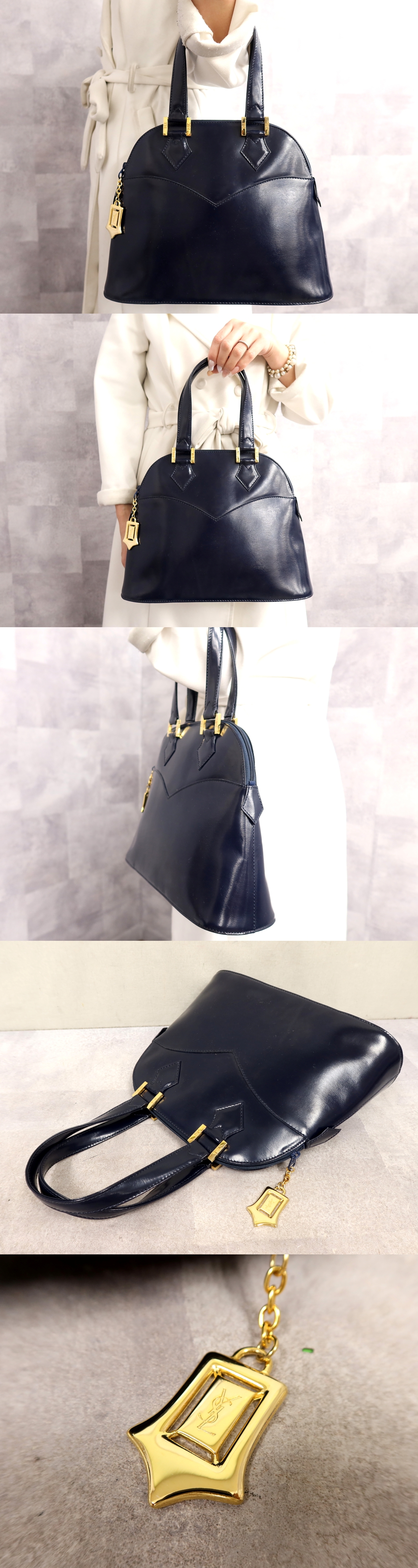 ●超美品●YSL Yves Saint-Laurent イヴ・サンローラン●カーフ レザー 本革●ハンド バッグ●ネイビー●ゴールド金具●腕掛け●Js65717 收藏
