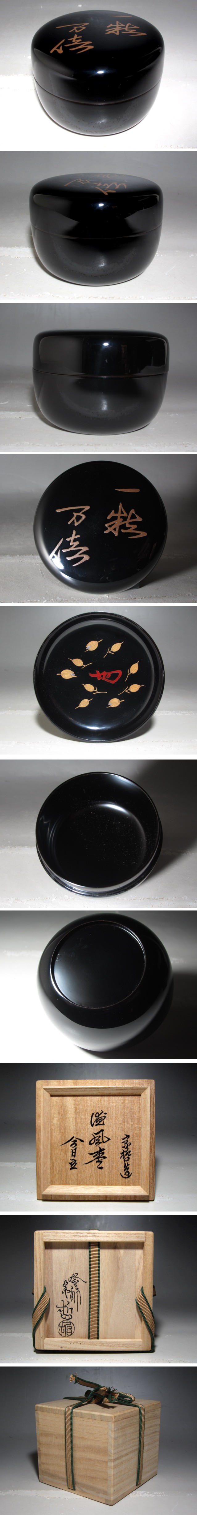 千家十職中村宗哲作の徳風棗です。 趣のある美しい景色の名品です。 蓋裏に裏千家十四世淡々斎の花押があります。 底部に銘があります。 【中村宗哲(なかむらそうてつ) 】 千家十職の塗師。 中村家は、400年近く続く塗師の家。 明治時代以降は茶道具の塗師専業となっている。 現当代は2006年十三代中村宗哲を襲名。 サイズ 直径8.2cm/高さ6.5cm(多少の誤差はお許しください) 状態 一見して疵やヒビ・直しは見られません。。 骨董品という事をご勘案頂き、時代経過のスレや、小さな傷がある場合があるかもしれませんのでご承知置きください。 | |||