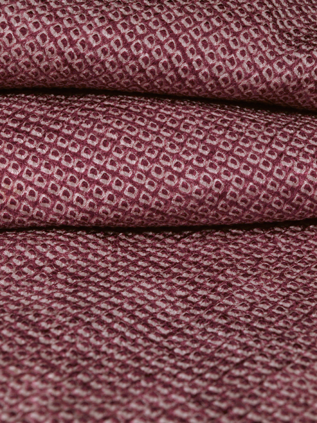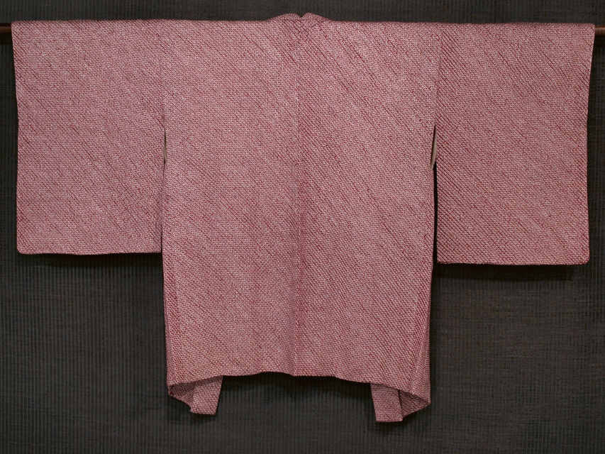 沈んだ真紅(しんく)色の地に、総絞りで鹿子の文様が施されている、綸子の羽織です。袷仕立てです。 落ち着いたかわいらしさのあるお色目です。絞り感がしっかりとあります。 ユーズド品で、羽裏が黄変しています。また、あまり目立ちませんが、右前袖口下に直径約 3cm の薄めの黄変が 1 か所、左前袖たもとへりに直径約 1cm の薄めの黄変が 1 か所あります。そのほかに目につく大きなしみやよごれなどのダメージはありませんが、状態ランク=「D」のご着用対象外、リメイク素材用とさせていただきます。 |