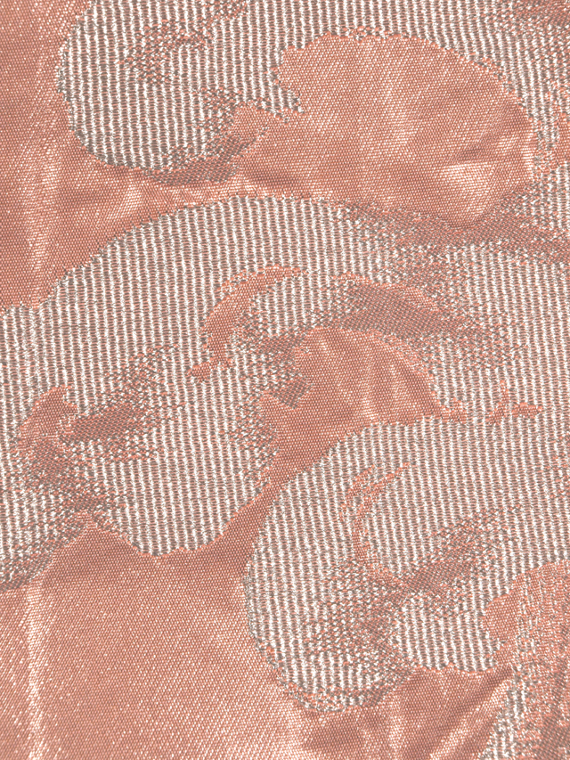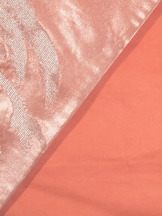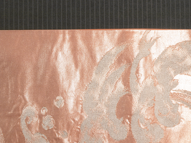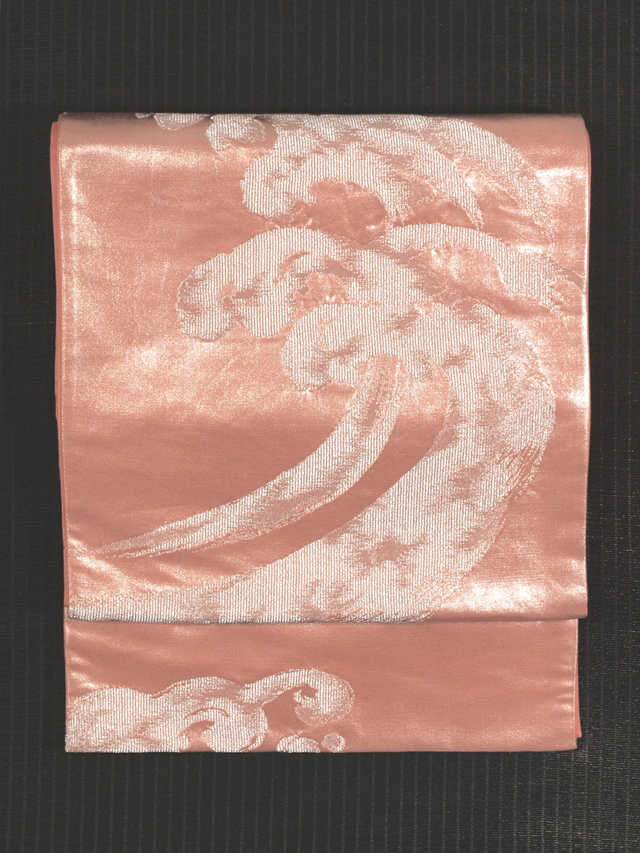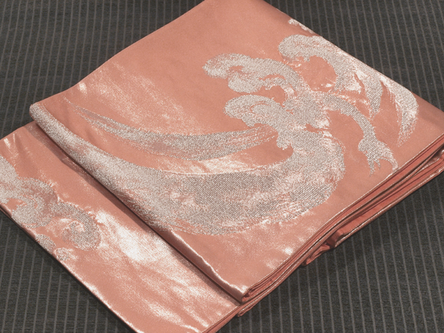 全体的な印象としては銀色がかった薄紅(うすべに)色の地に、立つ波の文様が織り込まれている西陣織の袋帯です。 華やかなお色目です。明るく晴れやかな伝統文様が縁起の良い印象です。 ユーズド品で、前の折り跡と結びジワがありますが、目につくしみやよごれ、褪色などのダメージはなく、全体的にはきれいな状態です。 |