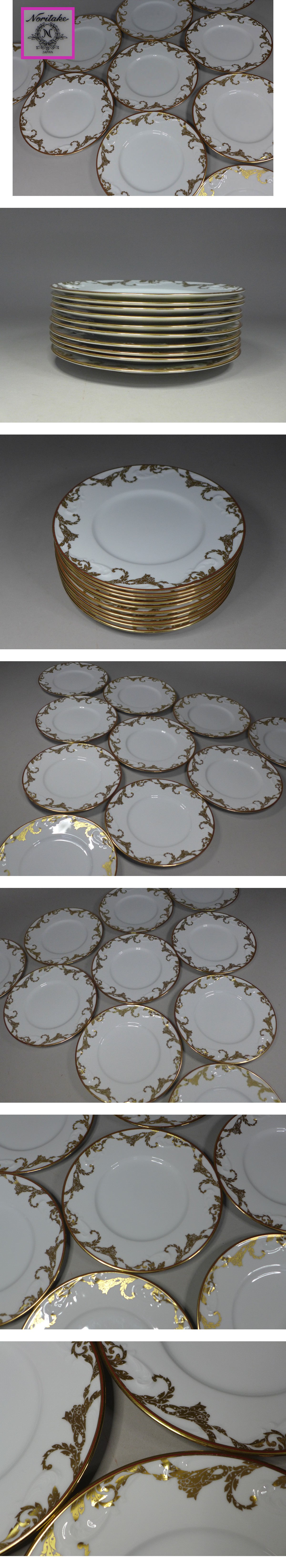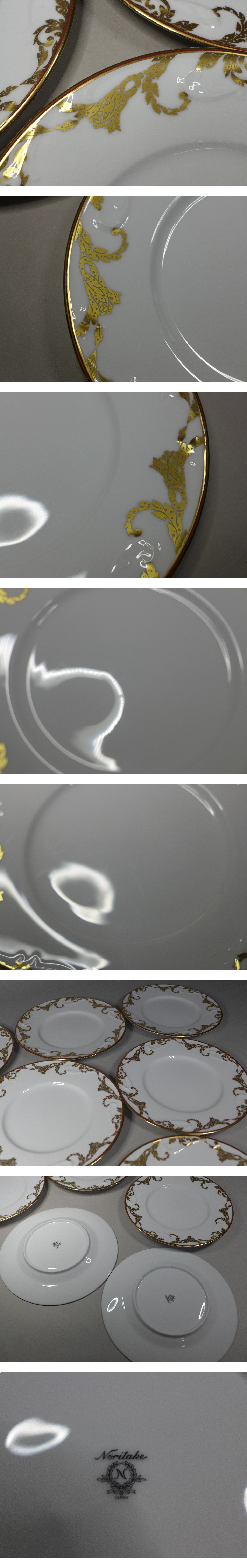 ノリタケ 草紋金彩レリーフ プレート大皿27cm 10枚です。新品ではなく実際に使用されていたものですが、大きく目立つ疵も無いです(ただし画像ではわかりにくいですが、光の角度によっては表面の使用や重ねによるスレ疵が少々あります)。