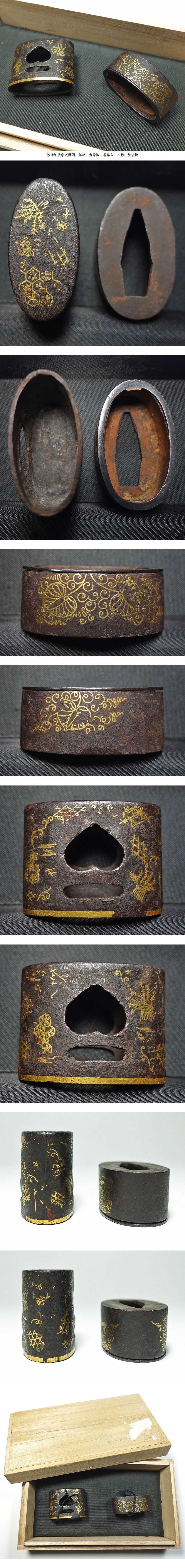 ★鉄地肥後象嵌縁頭 無銘 金象嵌 大型柄頭 本歌 肥後拵 猪目透し 肥後金工 細川三斎 刀装具 外装 拵金具 桐箱入 收藏