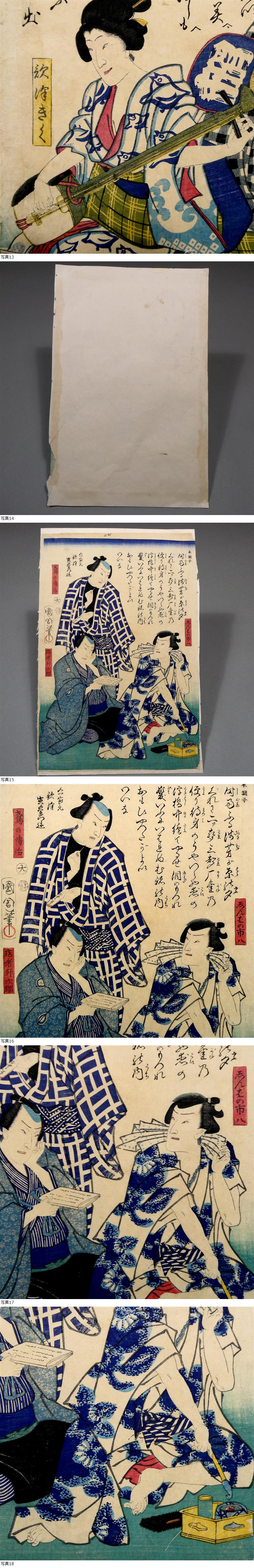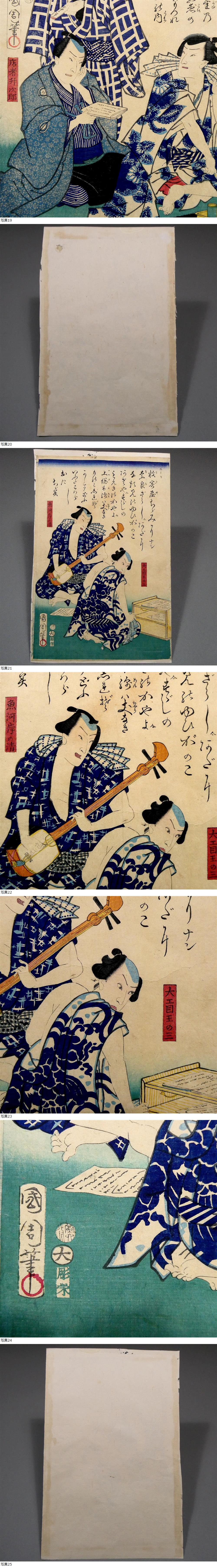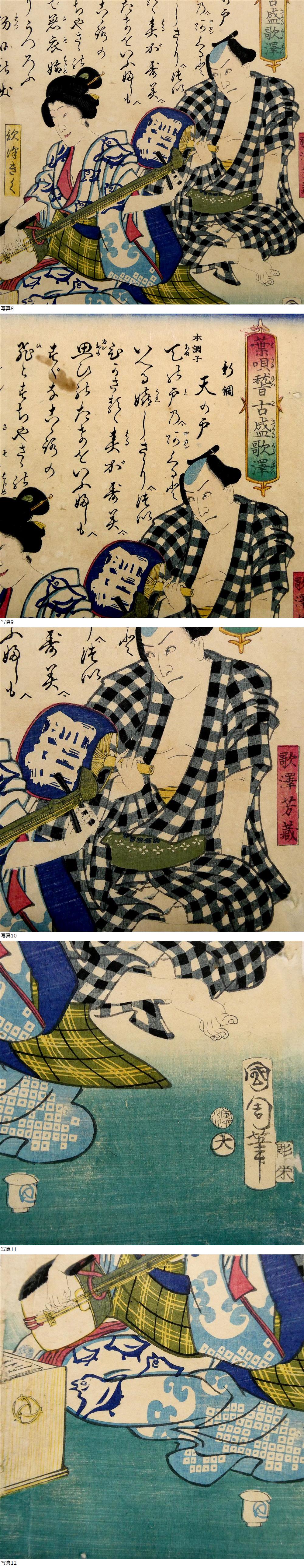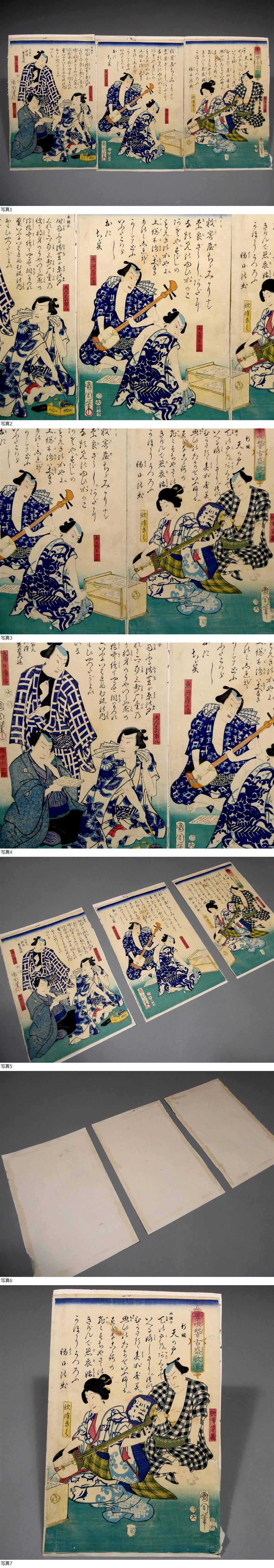 ■ 豊原国周 江戸時代 木版浮世絵 「葉唄稽古盛歌澤」3枚続揃い 役者見立て 端唄稽古 市川団十郎 沢村田之助 ■