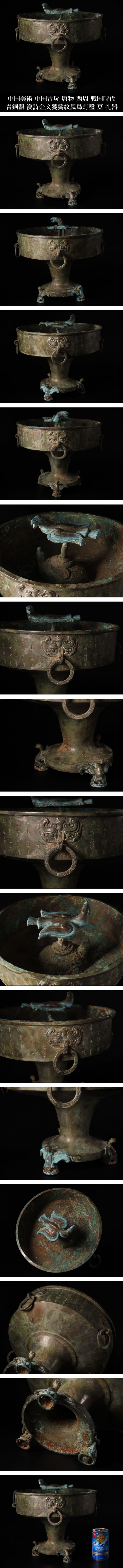 【ONE'S】中国美術 中国古玩 唐物 西周 戦国時代 青銅器 漢詩金文饕餮紋鳳鳥灯盤 径27.5cm 重量3.95kg 豆 礼器 古美術品 | |||