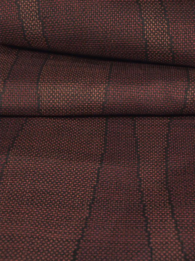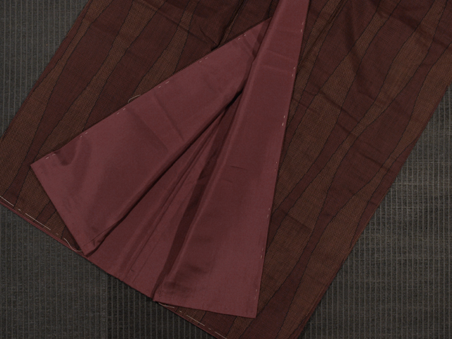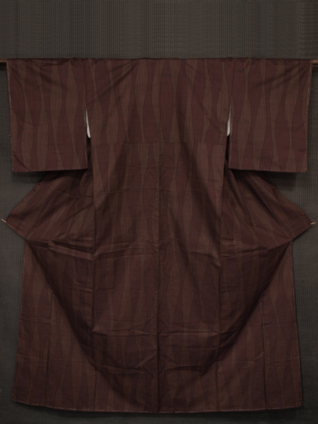 全体的な印象としては赤錆(あかさび)色といった感じの地に深緋(こきひ)色よろけ縞の文様が絣で織り込まれている本場大島紬です。袷仕立てです。15.5 算(よみ)の 7 マルキ一元式です。 シンプルで粋な雰囲気が感じられます。さらりとした手ざわりの大島紬らしい地風です。 しつけ付きの仕立て上がり未使用保管品で、胴裏に直径約 1cm の薄めのよごれが 1 か所ありますが、そのほかに目につくしみやよごれ、褪色などのダメージはなく、ほぼ新品同様にきれいな状態です。 |