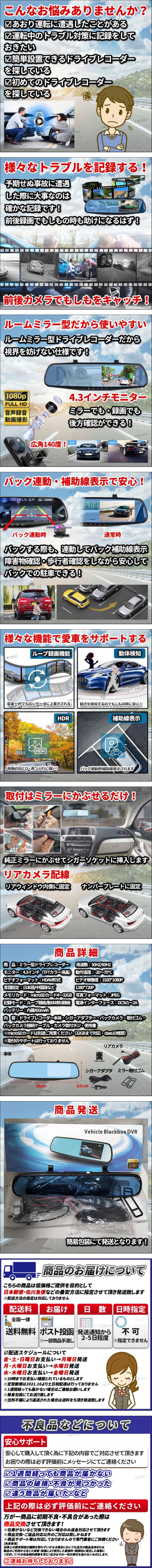 | ミラー型ドライブレコーダーになります! ご覧いただきありがとうございます! もしもの対策・瞬間を記録するドライブレコーダー! ミラー型なので、視界の妨げにならず使用でき、バックカメラ搭載なので前方・後方からも録画をします ループ録画・動体検知録画・駐車監視・自動電源オフなどの多機能仕様! ★140°広い視野角:広角レンズで広範囲の映像を記録します ★ループ録画:録画容量がいっぱいになると、古いデータを削除・新しい映像を録画します あおり運転対策・事故の記録まで確かな記録を実現! | ||