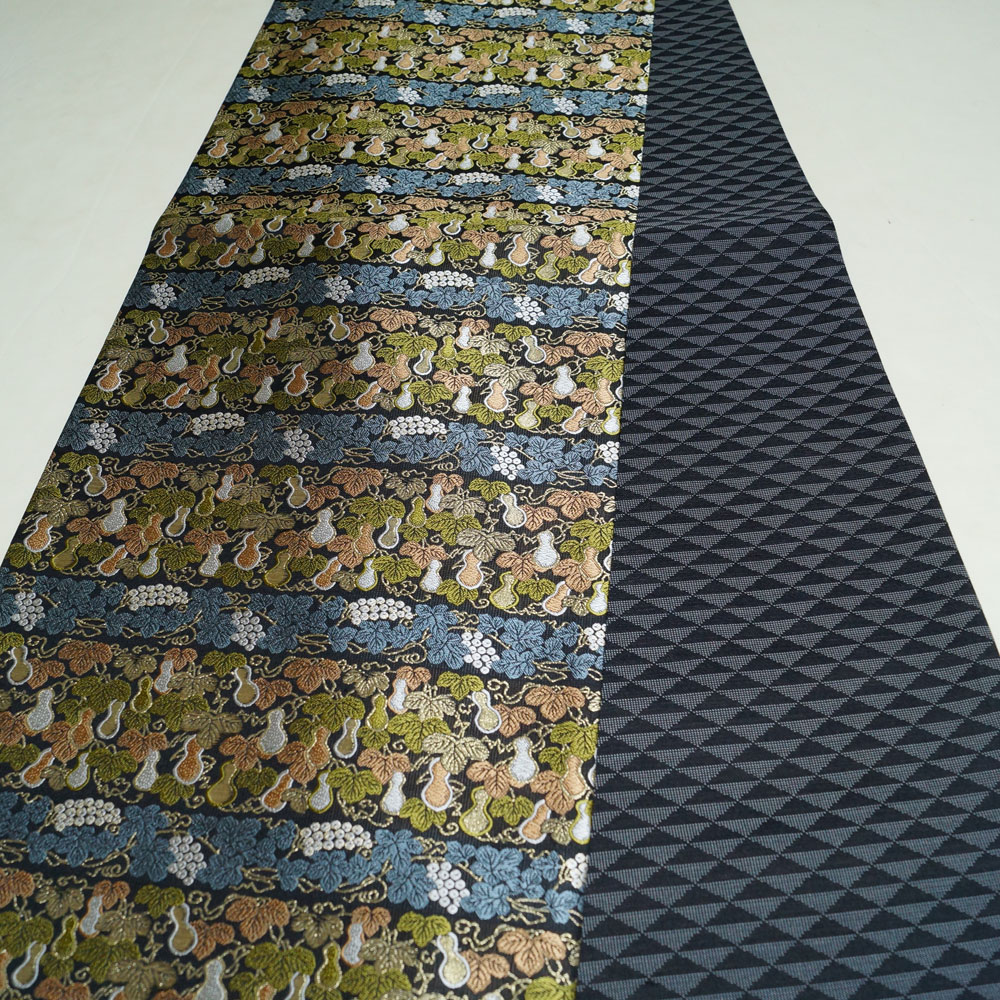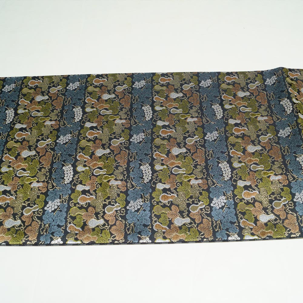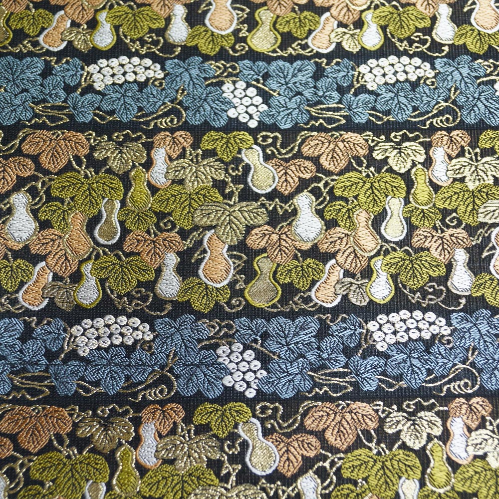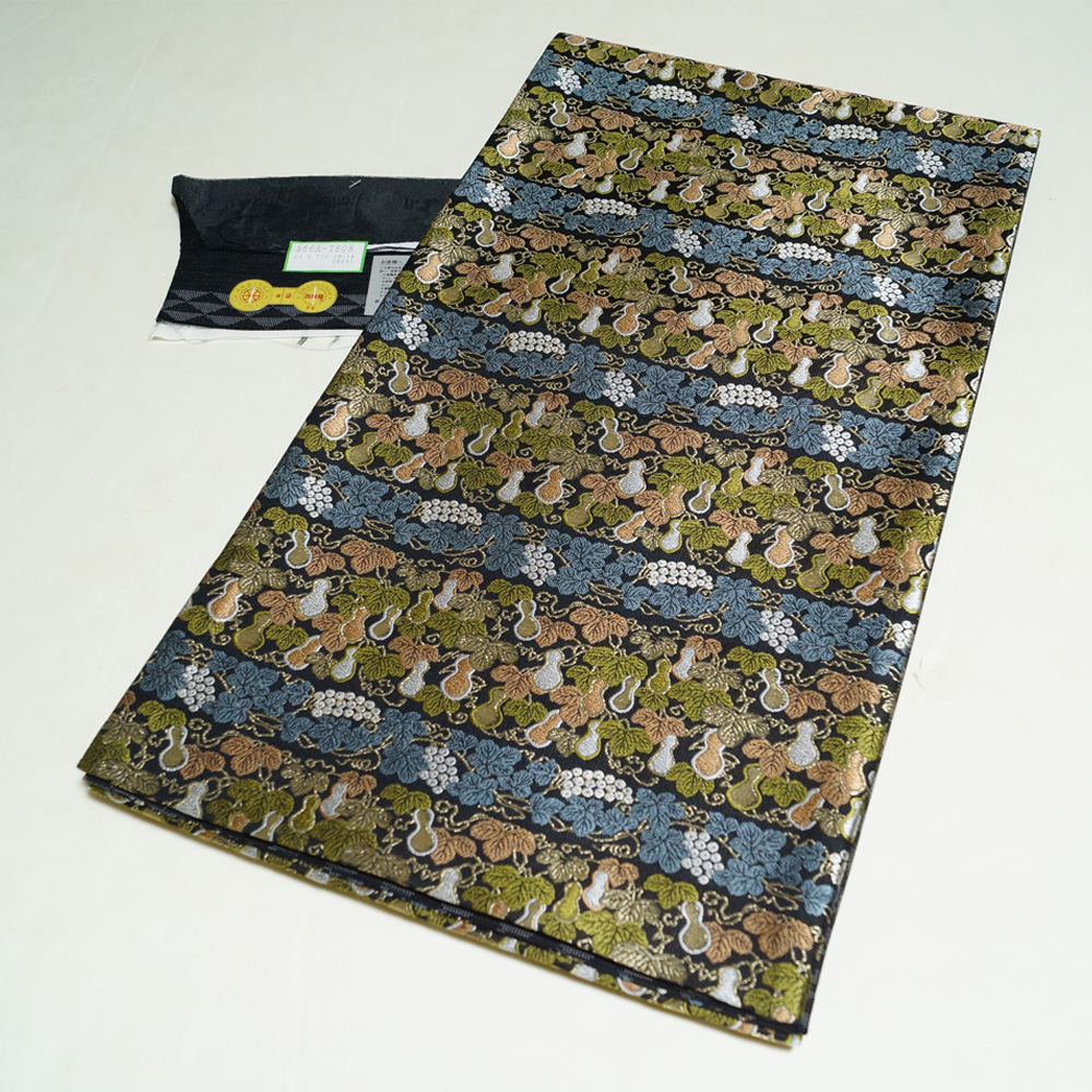 袋帯 未使用品 洛陽織物 京都西陣織の老舗 横段に瓢箪・葡萄模様 全通柄 黒色系 西陣 中古 リサイクル着物 洛陽 仕立て上がり きもの天陽 收藏