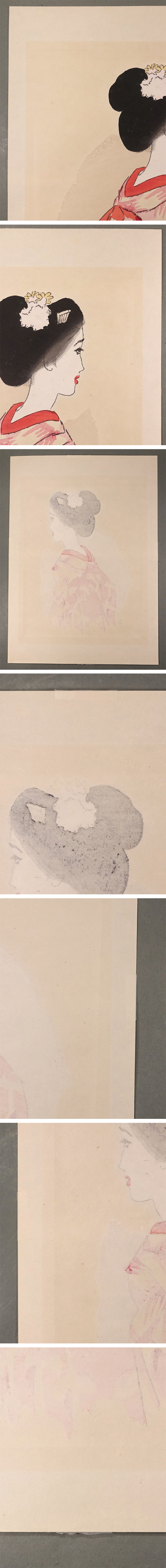 美しく着飾った舞妓の横顔を表した一作で、遠くを見つめる憂いに満ちた表情や色白の肌、曲線的で華奢な体躯など夢二の追求した女性美が見事に表現されており、ほっそりとした首筋とそこへ掛かる細い毛髪がはんなりとした色香を感じさせます。