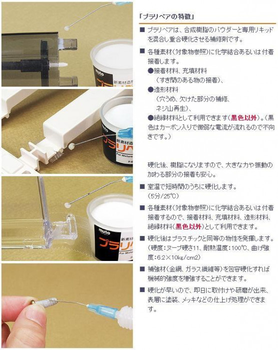 | 固まればプラスチックそのもの。化学結合で強力補修!!折れ・割れ・欠けを再生補修出来るキットです。強力溶着・穴うめ・ネジ山再生まですべてこれ1つでOK!! |