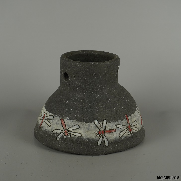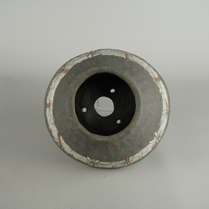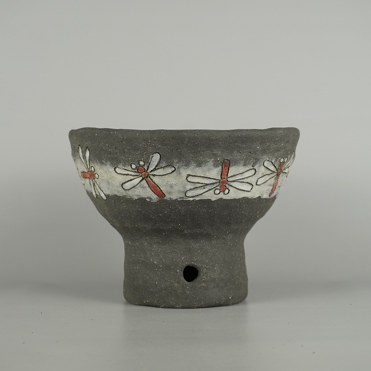 盆栽鉢 文山 越前文山 小型 長辺 約 19.3cm 丸鉢 色絵 蜻蛉 とんぼ トンボ 高杯 鑑賞用 観賞用 現品 新品 收藏