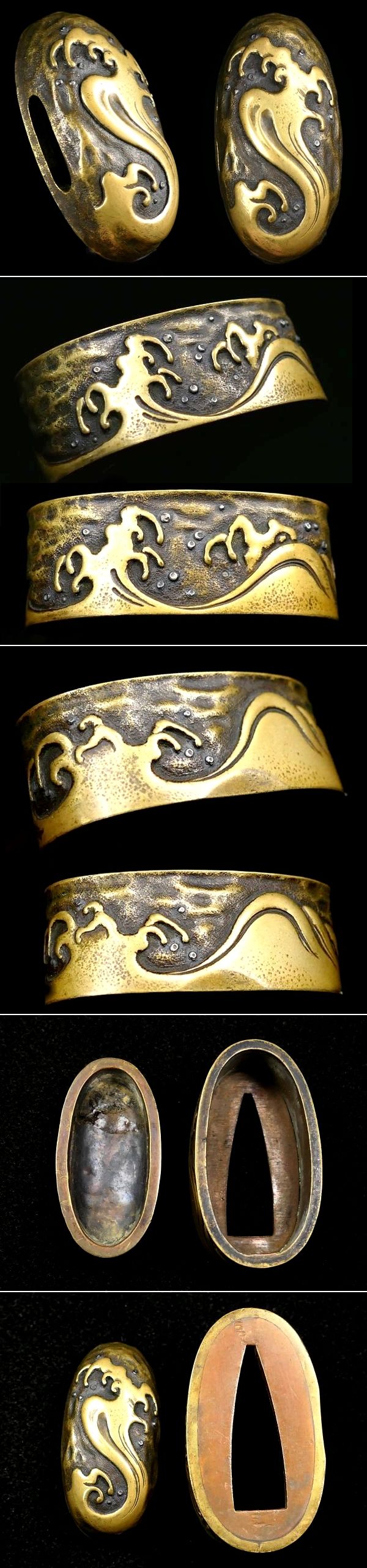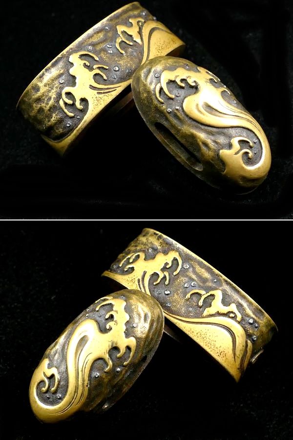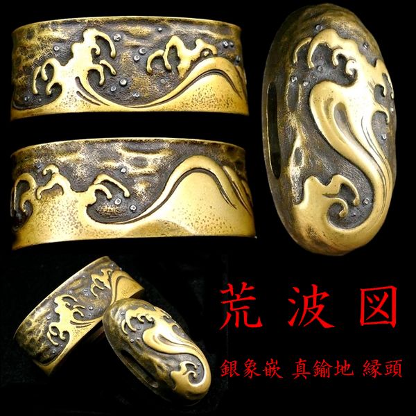 【刀装具 #4311 新入荷】 (縁頭) 平戸の名作 大迫力の「荒波図」 銀象嵌 真鍮地縁頭 高彫り細工の見事な拵栄えする一品です 收藏