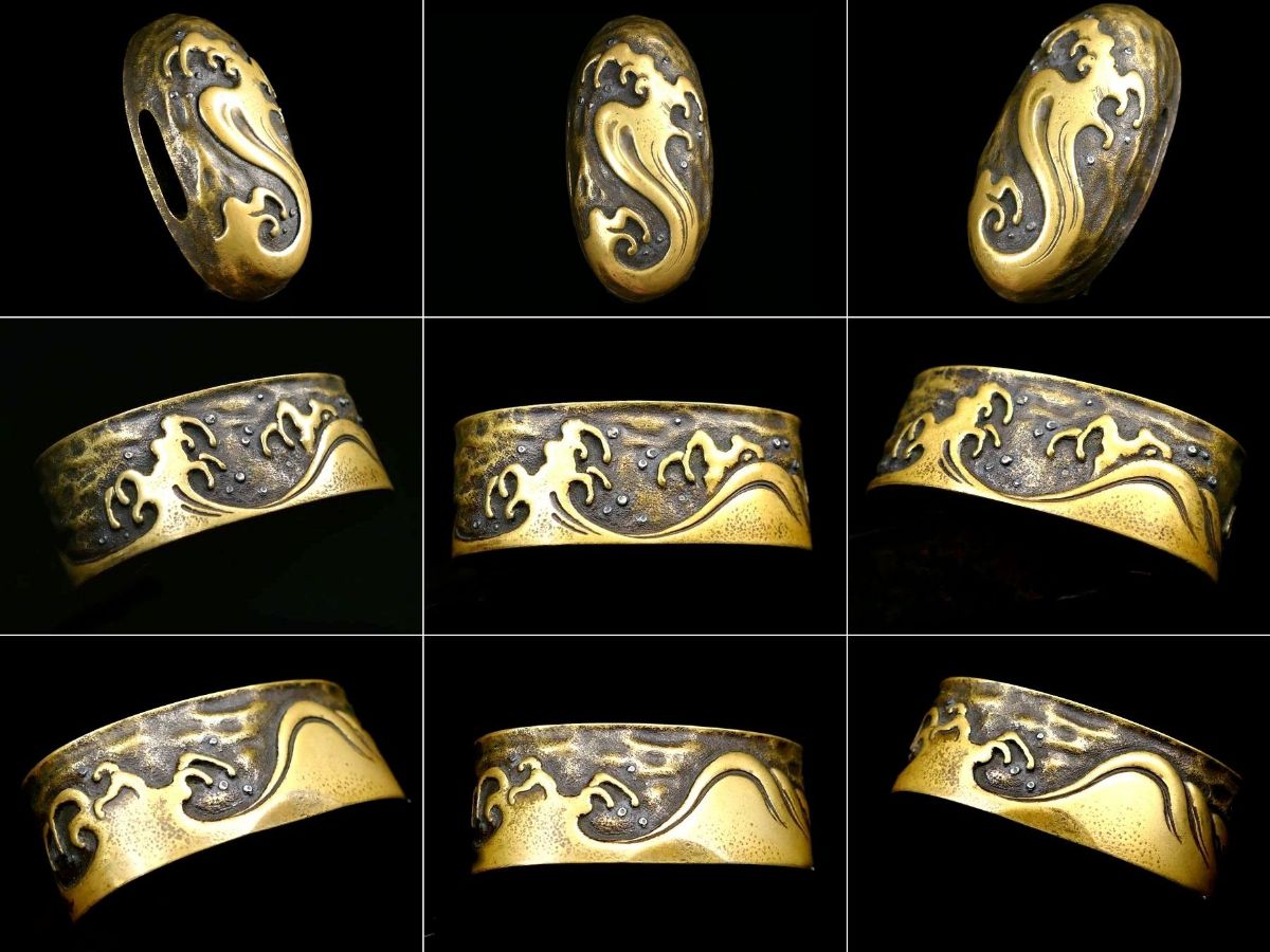 | 商品説明 | 大変力強い高彫り細工により 荒れ狂う荒波の様子が見事に表現された 言える上手の金工作品です。 作行から見て 平戸の名作と推測しております。 詳しくは画像にてご確認下さい。 鑑賞用にも拵用にも 幅広く活躍する一品と存じます。 この機会に是非手に入れて下さい。 【しっかりとした細工】 【見応えある高彫り】 【上手の金工作品】 寸法: (縁) 約 3.72cm × 約 2.08cm × 約 1.42cm (厚み) (頭) 約 3.22cm × 約 1.75cm × 約 0.94cm (厚み) 時代: 江戸時代 材質: 真鍮地 銘 : 無銘 状態:特に気になる傷みはなく良好。画像にてご判断下さい。 :許容範囲内の時代傷みはご理解下さい。 |
