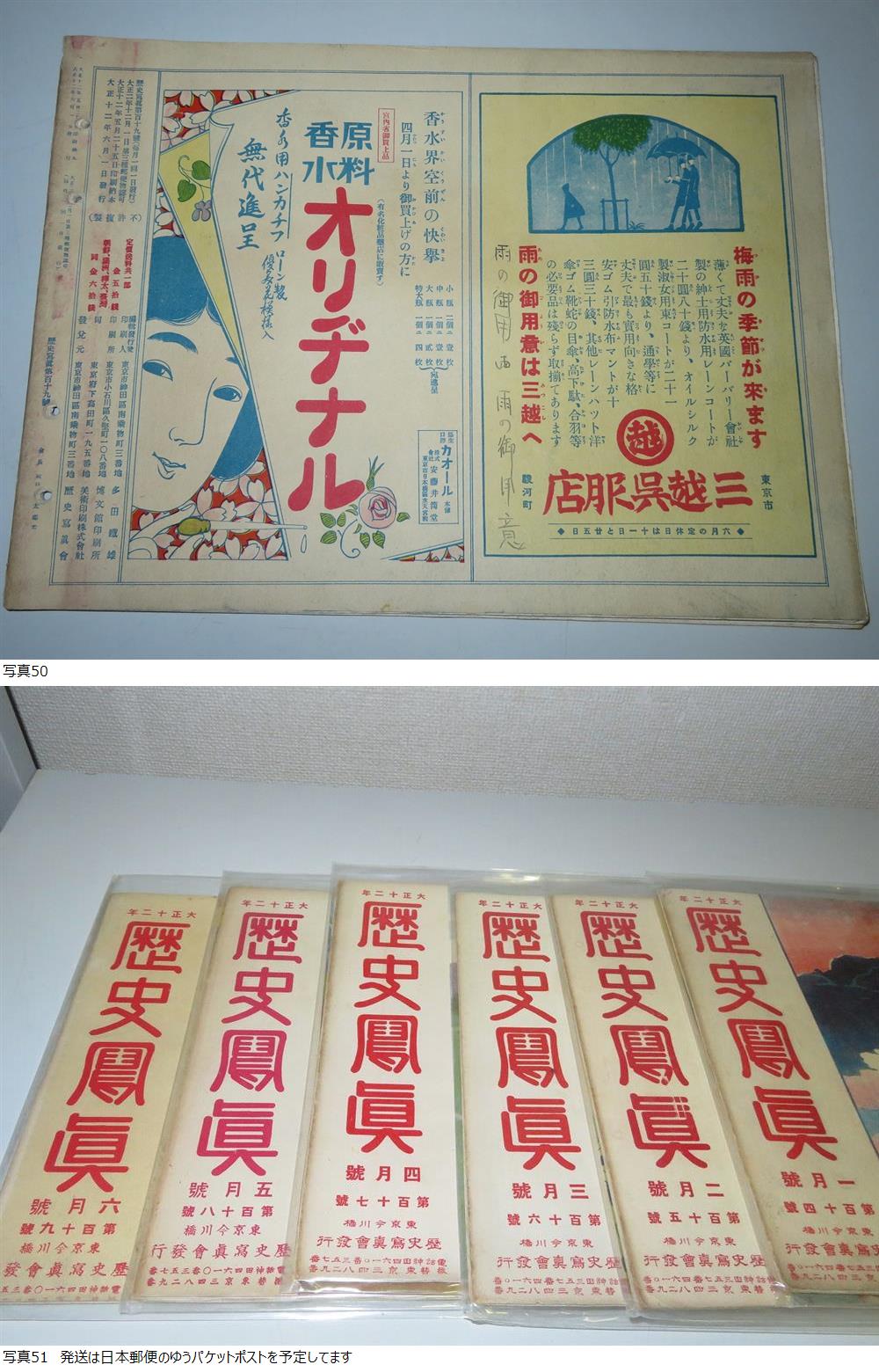 ※◎【本文の解説をよく読まれてご検討ねがいます。】 誠に申し訳御座いませんが24時以内に連絡、ご入金処理のできる方、および商品受領確認後に早急に取引ナビにて「受取連絡」のできる方のみ入札願います。 評価が新規の入札者様は入札の際、質問等で予め連絡ください。事前連絡がない場合はこちらで入札の取消(削除)を実施しますことを予めご了承願います。 転売業者の方は落札後「受取処理」の遅延、遅滞の発生率が極めて高いので入札をご遠慮願います。 商品名 : ★ 大正レトロ 歴史写真 大正12年1月号~6月号 6冊一括 【現状品】★ 付属品 :なし。 商品詳細 :歴史写真会発行の歴史写真 大正12年1月号~6月号の6冊一括でお願いします。 大正時代(戦前)の貴重な写真が多数記載されてます。 全体的に経年劣化(ほつれ、ヤケ・シミ・破損)等あります。ページの欠落は無いと思います。見るには問題ございません。 外観は画像にてご確認ください。 現状でのお渡しとなります。 以上ご興味のある方説明文をよく読まれた上、入札頂けます様お願い申し上げます。 説明文の理解力の無い方、思い込みの激しい方はくれぐれも入札しないで下さい。 入札終了まじかのご質問もお答えできませんのでご了承下さい。 到着後の使用方法等などについてサポートは出来ませんので予めご了承ねがいます。 入札の取り消し、キャンセルは出来ませんのでお間違えないようにお願致します。 発送は日本郵便(株)のゆうパケットポストを予定してます。 以上宜しくお願いします。 |