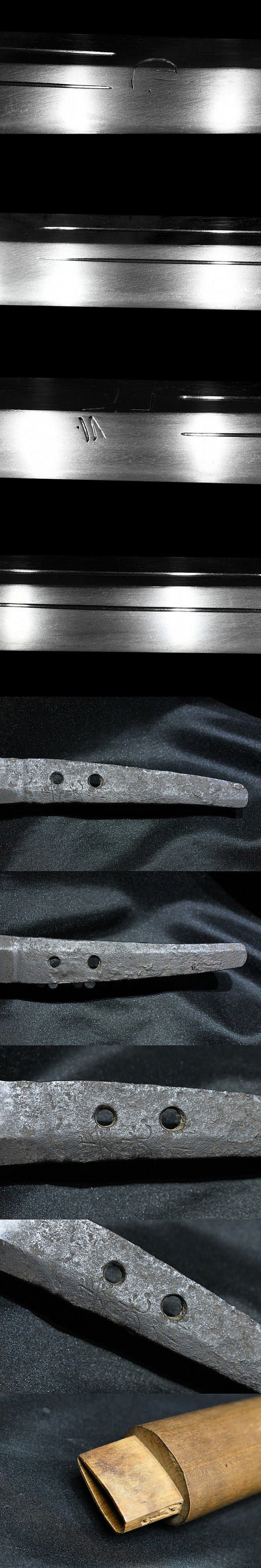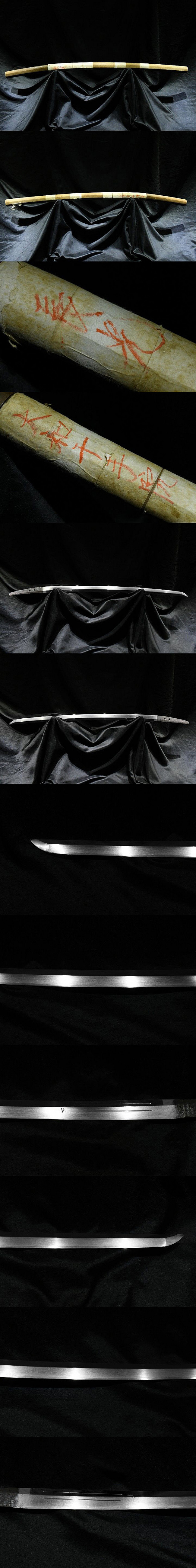 表【-】 裏【長光作】 種別: 刀 サイズ:長さ 68.5cm 反り: 1.4cm 目くぎ穴 2個 元幅:約 3.196cm 元重:約 0.702cm 先幅:約 2.157cm 先重:約 0.515cm 刀身重量:約 703.2g(ハバキ・柄をとった状態) 鞘全長:約 101.5cm |