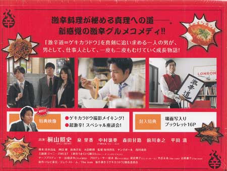 【内容】 飲料メーカー「ロンロン」の社員・猿川は、大阪本社での実力を認められ東京支社・営業促進室に異動となる。だが、異動初日に老舗酒店に営業に行くも失敗。店主の葛城を怒らせてしまう…。その日の夜、室長の谷岡、大河内らによって猿川の歓迎会が開かれる。しかし、そこで出てきたものは、驚くほどの激辛料理…!圧倒される猿川に谷岡は“ゲキカラドウ”なるものを唱える…。 【特典内容】 映像特典:ゲキカラドウ撮影メイキング!、超激辛!スペシャル座談会! その他特典:場面写入りブックレット16P | |||||||||||||||||||||||||||||||||||